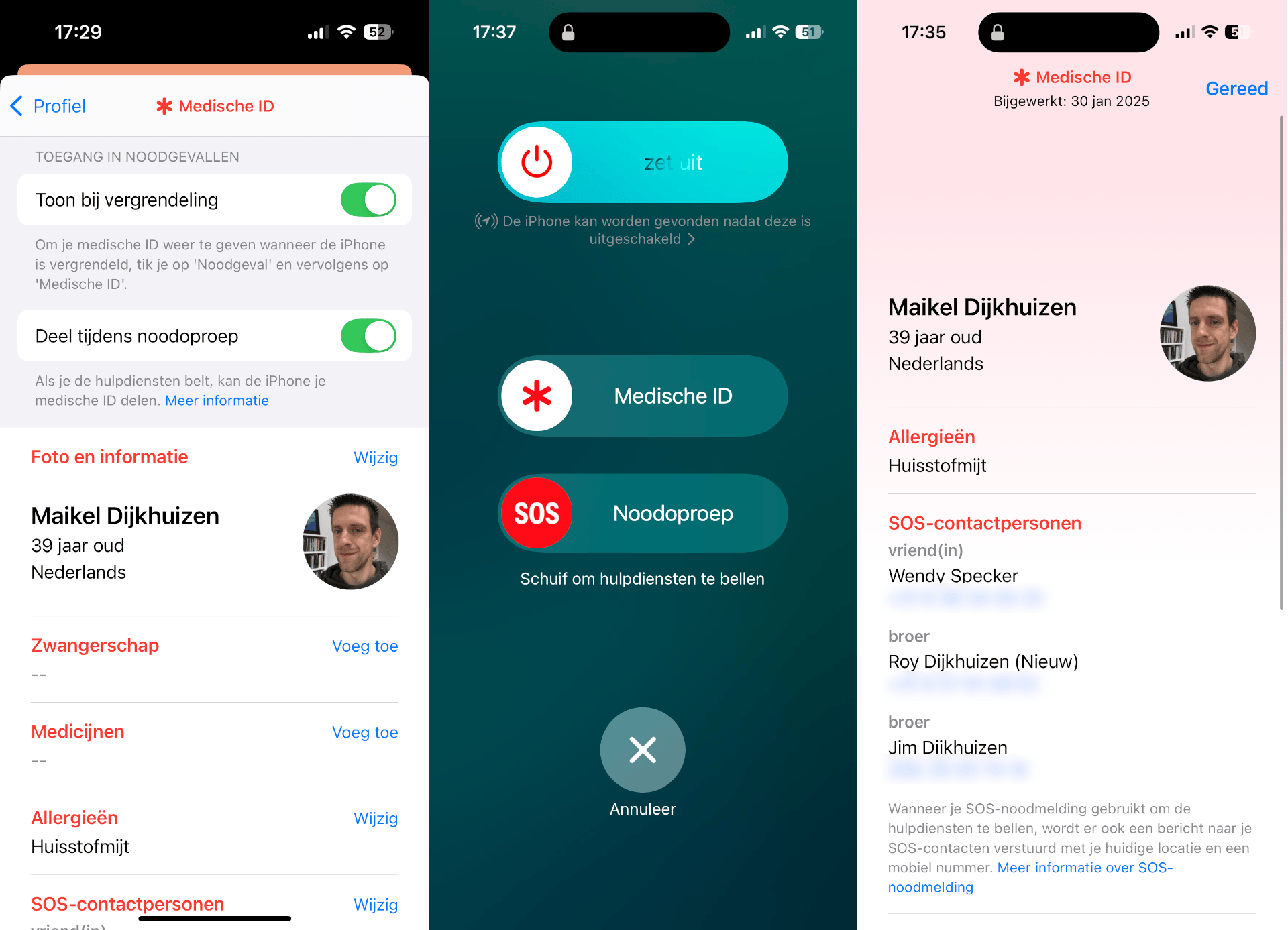 Tot slot is het belangrijk dat je SOS-contactpersonen instelt. Dat kan eveneens in het Medische ID. Tik achter SOS-contactpersonen op Wijzig en kies Voeg SOS-contactpersoon toe. Geef in een lange lijst daarna de relatie aan, zoals broer, zus, zoon, dochter of partner. Bij een SOS-noodmelding ontvangen alle contactpersonen een bericht met de actuele locatie.