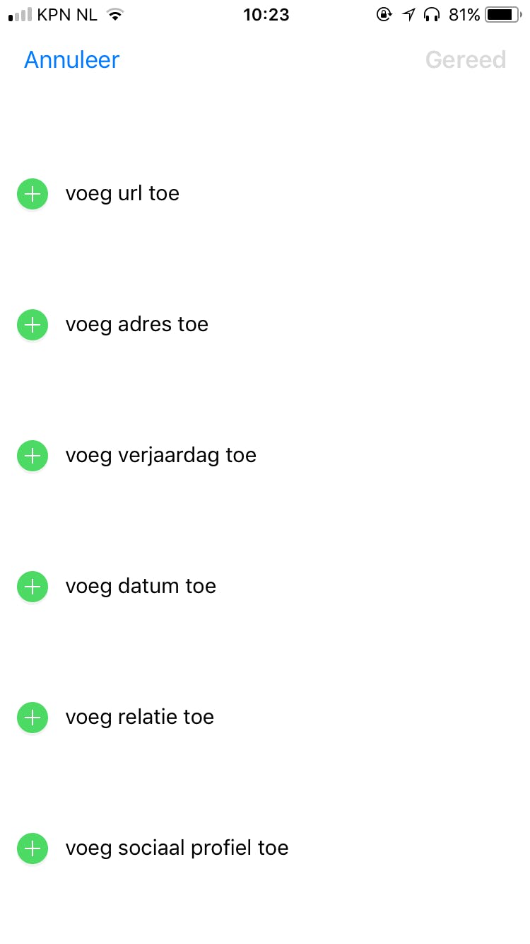 Na het kiezen van een label kan er een contactpersoon aan de relatie gekoppeld worden. Dit doe je door op de i-knop te drukken en in de lijst die verschijnt een persoon te selecteren. Druk vervolgens op Gereed.