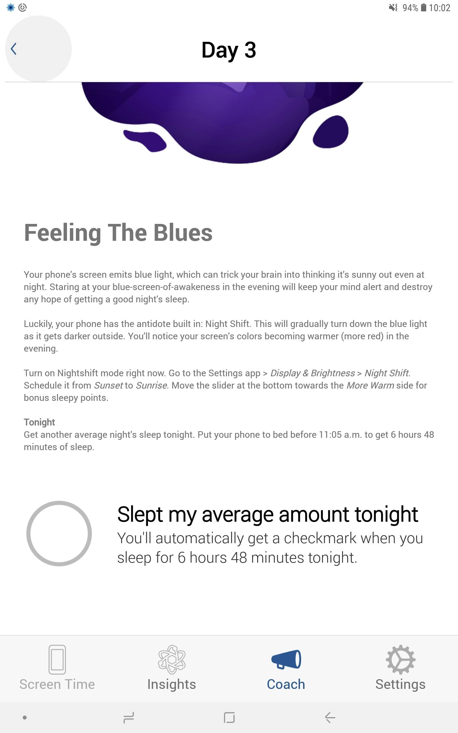 Afhankelijk van de doelstellingen die je in Moment hebt gekozen (zie tip 5) helpt een digitale coach je om overmatig smartphonegebruik tegen te gaan. De app geeft je namelijk diverse simpele opdrachtjes. Tik in het hoofdscherm op Coach en All Courses om een lesprogramma te volgen. Kies bijvoorbeeld achtereenvolgens voor Better Sleep / Start Course / Next en vul je leeftijd in. Op basis hiervan beoordeelt Moment hoeveel slaap je ongeveer nodig hebt. Geef via Next aan hoelang je wilt slapen. Na weer een klik op Next start je een veertiendaagse training. Moment geeft elke dag middels een herinnering aan wanneer je de smartphone dient weg te leggen. Op die manier bouwt de app je slaaptijd langzaam op. Verder komt de toepassing dagelijks met verse opdrachtjes op de proppen, zoals het activeren van de nachtmodus in de instellingen, het verlagen van de kamertemperatuur en het afplakken van felle ledlampjes in de slaapkamer. Wil je het smartphonegebruik rigoureuzer aanpakken? Misschien is het lesprogramma Mini Detox dan iets voor jou. De uitdaging is om je toestel twee dagen lang volledig uitgeschakeld te laten.