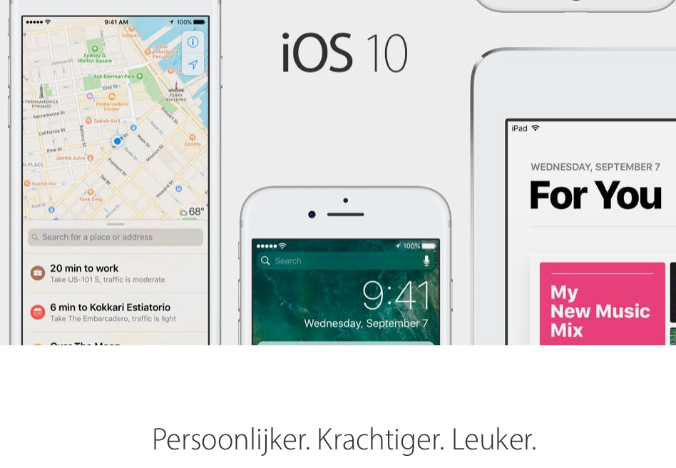 Apple heeft een eigen besturingssysteem, genaamd iOS. Dat is alleen beschikbaar voor de iPhone en de iPad. Daardoor is de keuze aan toestellen beperkt. Voordeel van het relatief gesloten iOS is dat er weinig kans is op een virus. Ook kun je ervan uitgaan dat het besturingssysteem prima op de ondersteunde smartphones werkt. De laatste versie is iOS 10 en die is standaard geïnstalleerd op de meest recente iPhone: de iPhone 7. Het besturingssysteem werkt ook op de iPhone 6s, de iPhone 6, de iPhone 5s, de iPhone 5c en de iPhone 5. Ook de grotere Plus-modellen van de iPhone 6, 6s en 7 kunnen iOS 10 draaien. Omdat iOS een gesloten systeem is, kun je alleen inhoud uit de App Store installeren. Als je de smartphone op je pc aansluit, kun je niet zomaar de bestandsstructuur inzien. Dit maakt het iets gecompliceerder om bestanden van je iPhone naar je pc te kopiëren. Het is niet mogelijk om iOS op een toestel van een andere fabrikant dan Apple te installeren en als je eenmaal iOS 10 op je iPhone hebt geïnstalleerd, is het niet mogelijk om naar iOS 9 te downgraden. Apple-smartphones hebben trouwens een eigen oplaadaansluiting, genaamd lightning. Je hebt dus een speciale lightning-kabel nodig om je smartphone op te laden. Deze wordt uiteraard meegeleverd als je een iPhone koopt.