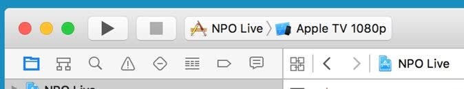 Sluit de Apple TV aan op de Mac met de USB-c kabel. Zorg dat de Apple TV aanstaat. Bovenin Xcode zie je grote knoppen voor Play en Stop staan. Rechts van deze knoppen staat de naam van de app (NPO Live of Uitzending Gemist), en daarnaast een Apple apparaat (bijvoorbeeld Apple TV). Klik op dit Apple apparaat. Selecteer nu in het lijstje dat verschijnt jouw Apple TV (deze staat waarschijnlijk helemaal bovenaan).