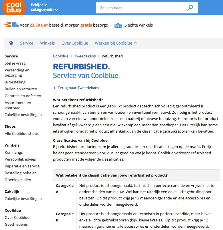 Er is een simpele methode om de staat van een item te tonen: door middel van foto’s van het betreffende product. Vreemd genoeg zie je dit zelden. Meestal staan er de standaard productfoto’s van de fabrikant bij, waarop een product in nieuwstaat en in de mooist mogelijke vorm wordt afgebeeld. Bij een gebruikt product zegt dat dus helemaal niets. De reden dat webshops geen echte productfoto’s plaatsen is overigens vrij simpel: het is te veel werk. Refurbished producten worden vaak in grote hoeveelheden ingekocht, en dan is het natuurlijk nogal wat werk om ze allemaal als afzonderlijk product in een webshop te plaatsen, inclusief foto’s. Soms zijn de producten ook helemaal niet op voorraad bij de webshop zelf, maar liggen ze bij een tussenleverancier. Vandaar dat er vaak een simpel classificatiesysteem gebruikt wordt, waarbij de staat kort wordt omschreven. Even bellen of mailen om te vragen naar de exacte staat en kleur is natuurlijk altijd een optie.