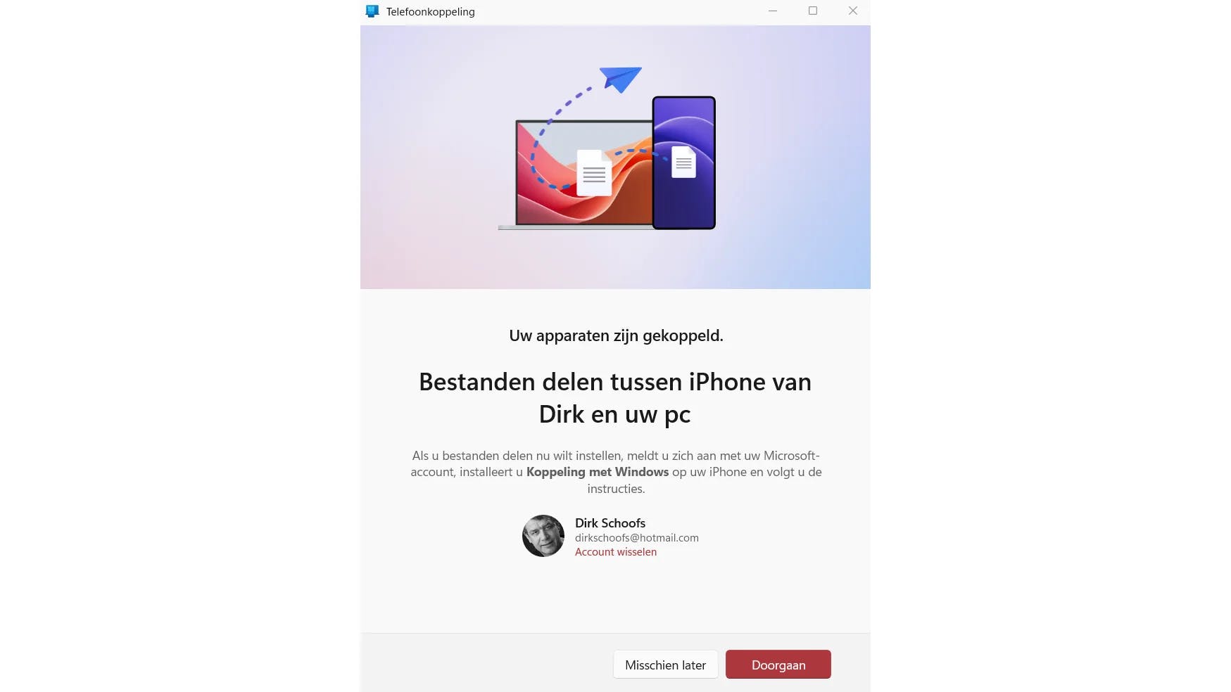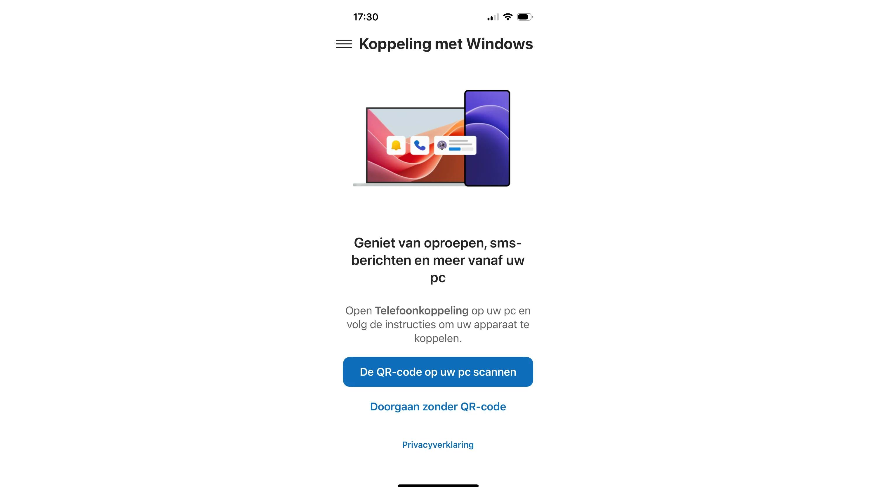 Kies de optie iPhone en dan verschijnt een QR-code. Scan deze code met de camera van je iPhone. Je krijgt de vraag of de iOS-app Koppeling met Windows geïnstalleerd mag worden. Sta dit toe. Open de mobiele app en geef toestemming om via bluetooth naar apparaten te zoeken. Zo kan je iPhone de Windows-pc vinden.