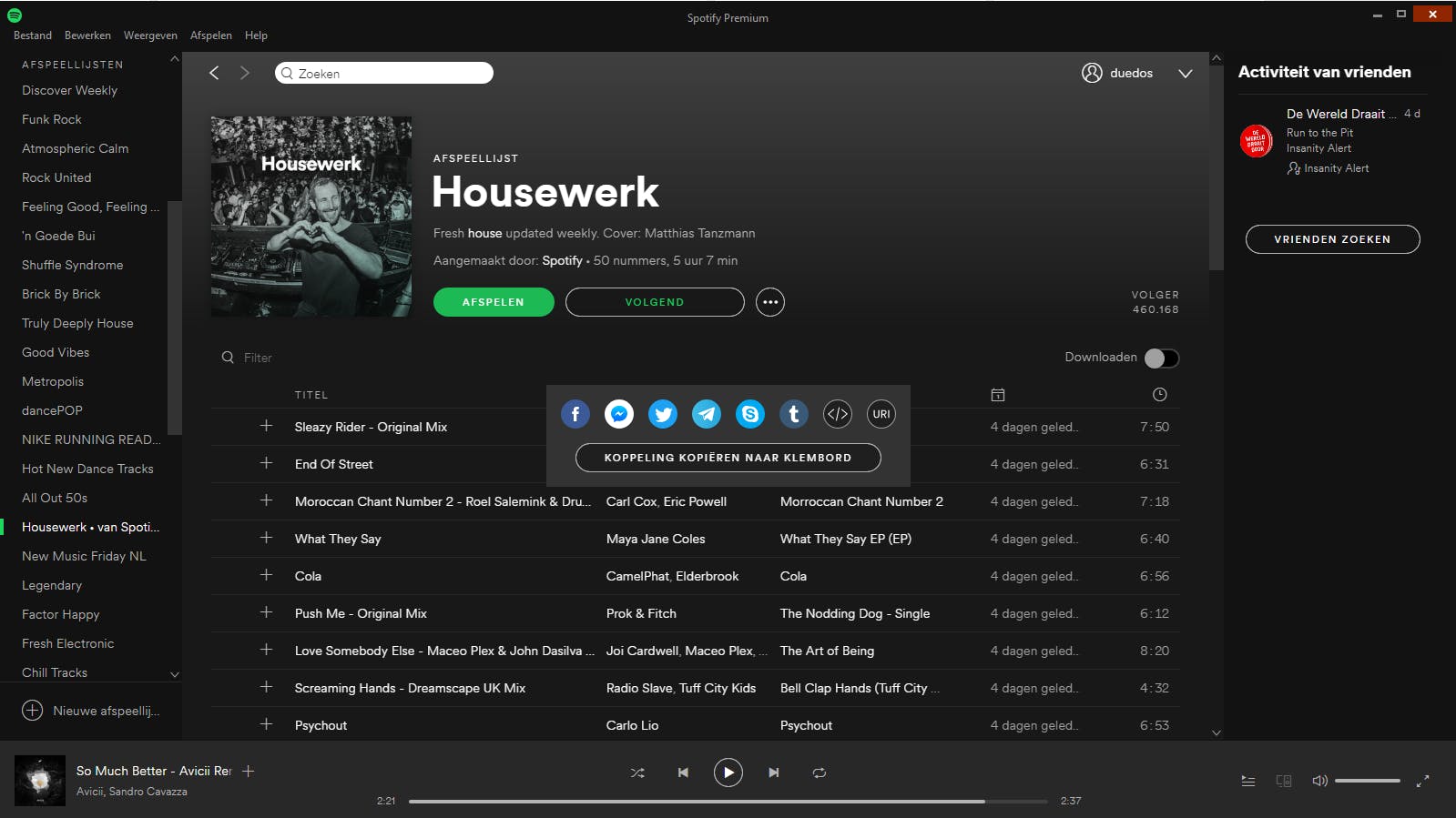 Als je Spotify op je desktop gebruikt, hoef je alleen maar met de rechtermuisknop te klikken op de afspeellijst die je wilt delen, en Delen… te kiezen. Je kunt nu kiezen op welke manier je de afspeellijst wilt delen. Je wordt nu via de browser naar de inlogpagina van de dienst gebracht, mocht je nog niet ingelogd zijn. Je kunt dan een bericht aan de gedeelde afspeellijst toevoegen voordat je de link plaatst.
