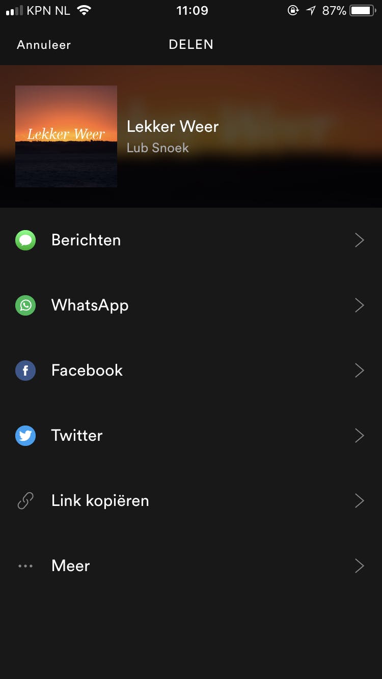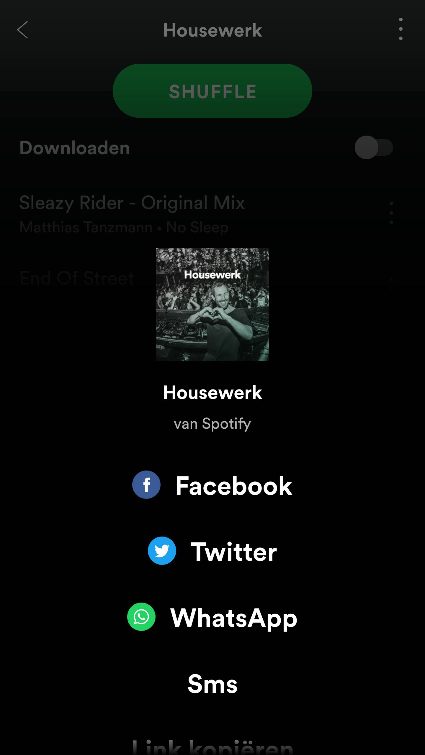 De reguliere manier werkt als volgt. Selecteer de afspeellijst die je wilt delen, druk op het icoon met de drie puntjes, en kies Delen. Kies een van de social media-icoontjes of klik op Link kopiëren om de url handmatig te delen. Via Meer krijg je het het welbekende deelscherm te zien waarbij je zelf kunt kiezen via welke app je de afspeellijst deelt.