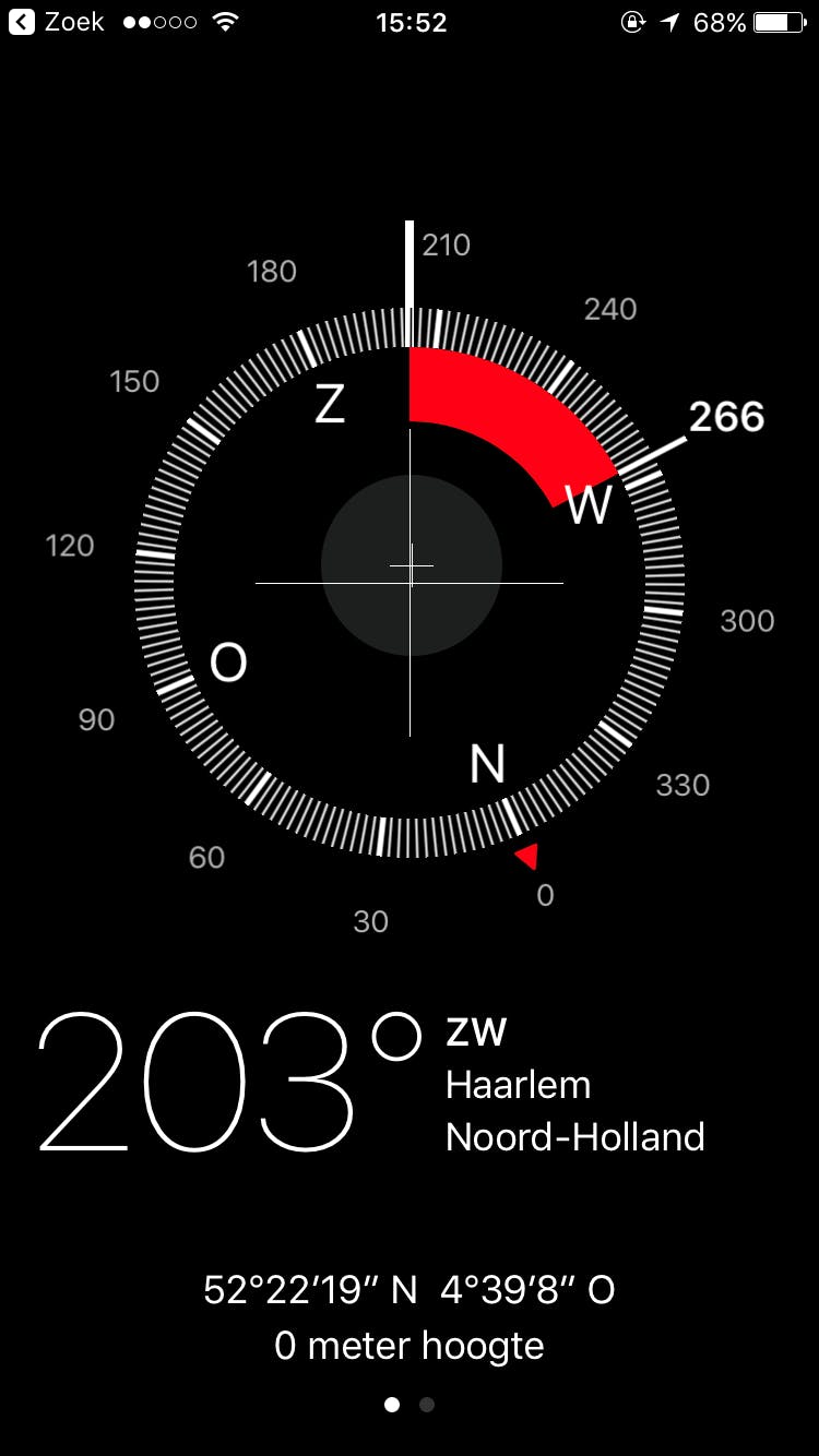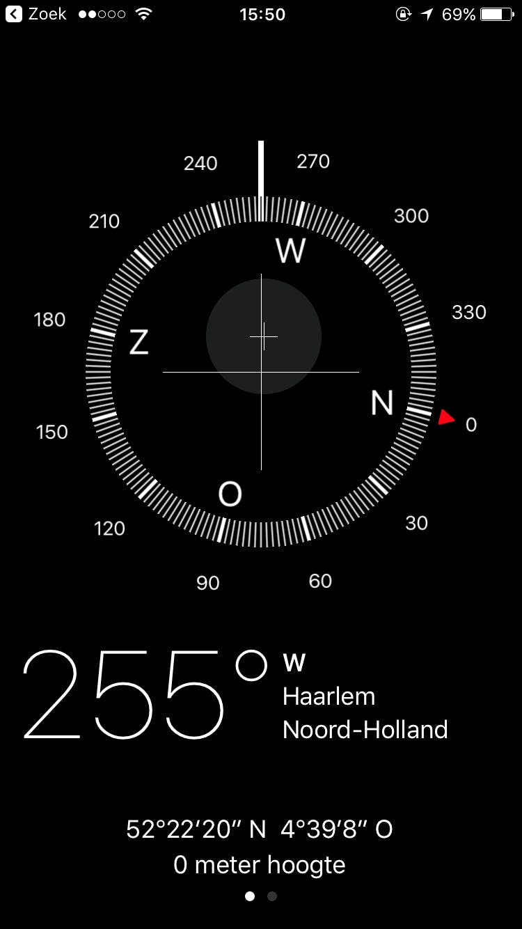 Om het kompas uit te lezen moet je je iPhone horizontaal houden. De kompasnaald zal dan naar het noorden draaien.