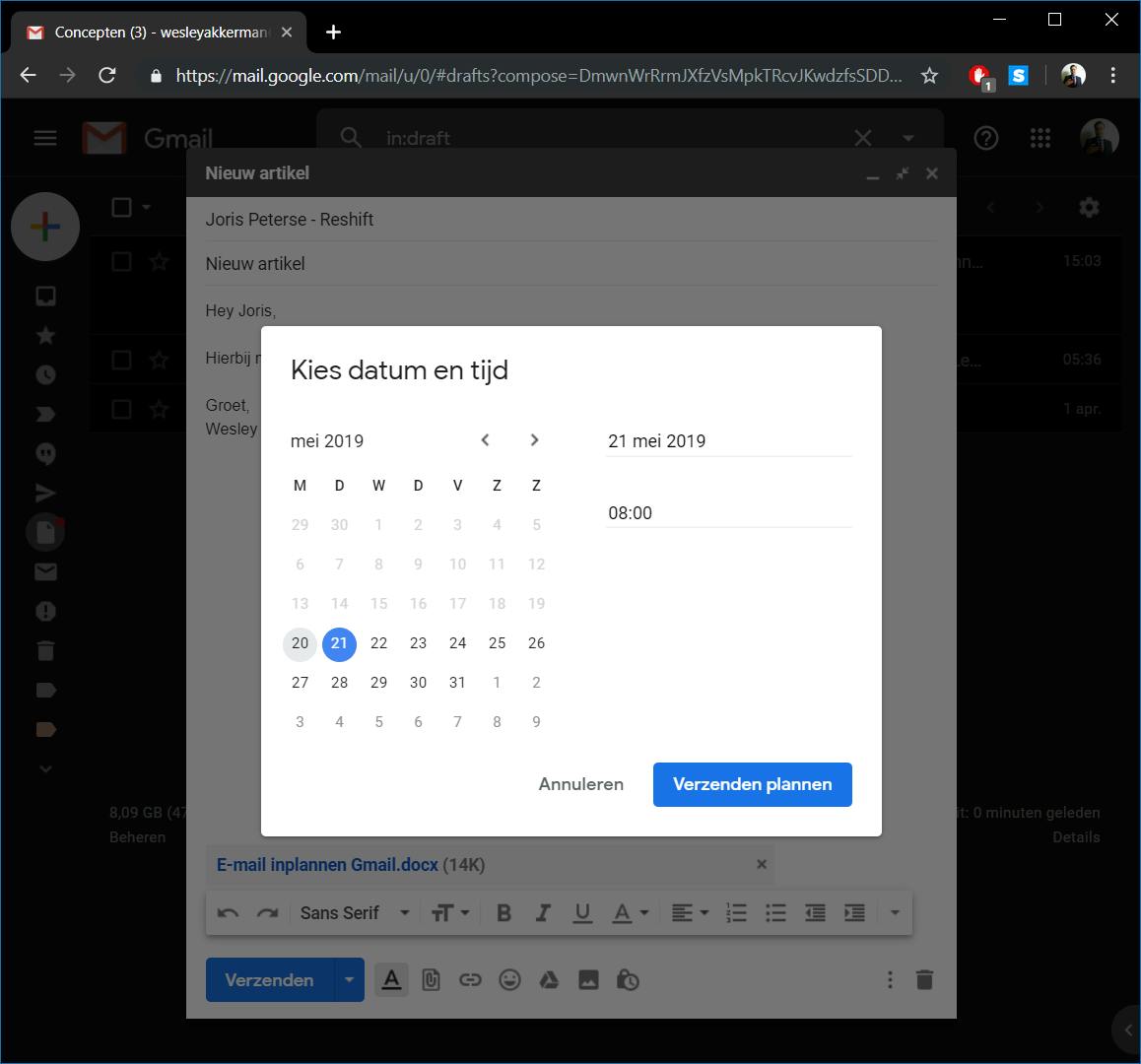 Binnen de officiële Gmail-applicatie werkt het later versturen iets anders. Je doet in principe hetzelfde als hierboven (e-mail opstellen, ontvangers invullen, et cetera), maar hebt geen toegang tot een snelkoppeling naar de verzendopties naast de verzendknop. In plaats daarvan druk je op de drie puntjes naast het blauwe verzendicoontje, waar je de optie Verzenden plannen ziet staan. Als je hier op drukt, dan krijg je dezelfde opties in beeld als wanneer je dit via het web zou doen.