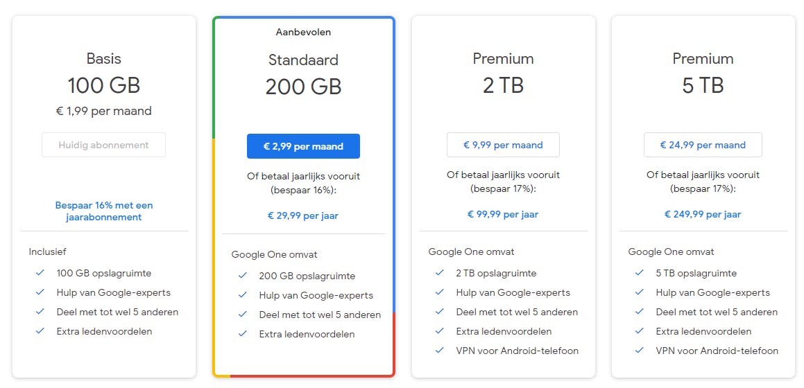 Standaard krijg je bij je Google-account 15GB gratis opslagruimte. Die vrije ruimte wordt verdeeld over Google Foto’s, Gmail en Google Drive. 15GB is een hoop, maar als je een fervent smartphonefotograaf bent, veel bestanden heen en weer mailt of je Drive-map gebruikt als dienst voor bestandsoverdracht, kan de boel snel vollopen. Voor 2 euro per maand krijg je 100GB opslagruimte van Google. Je kunt ook nog meer betalen voor nog meer extra opslagruimte, tot wel 30 terrabyte.