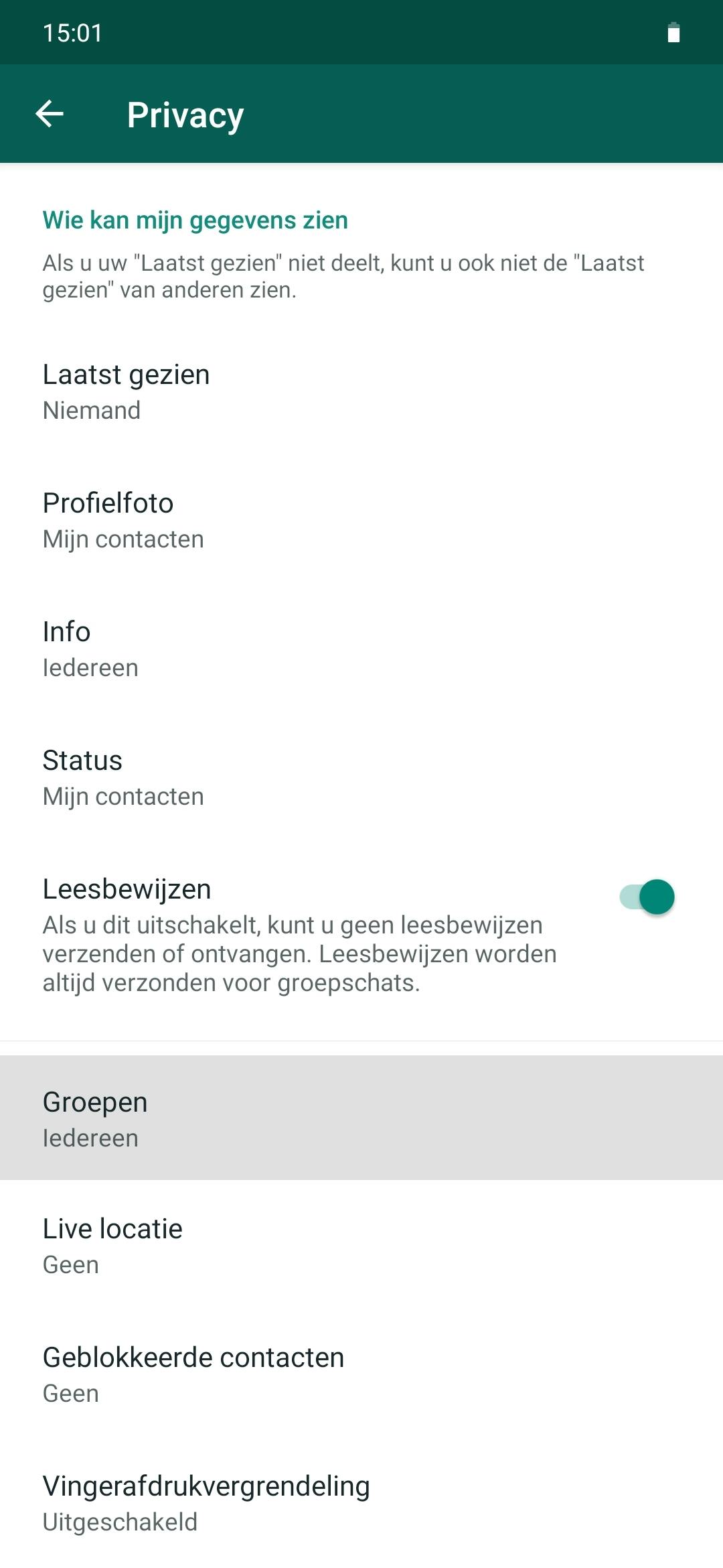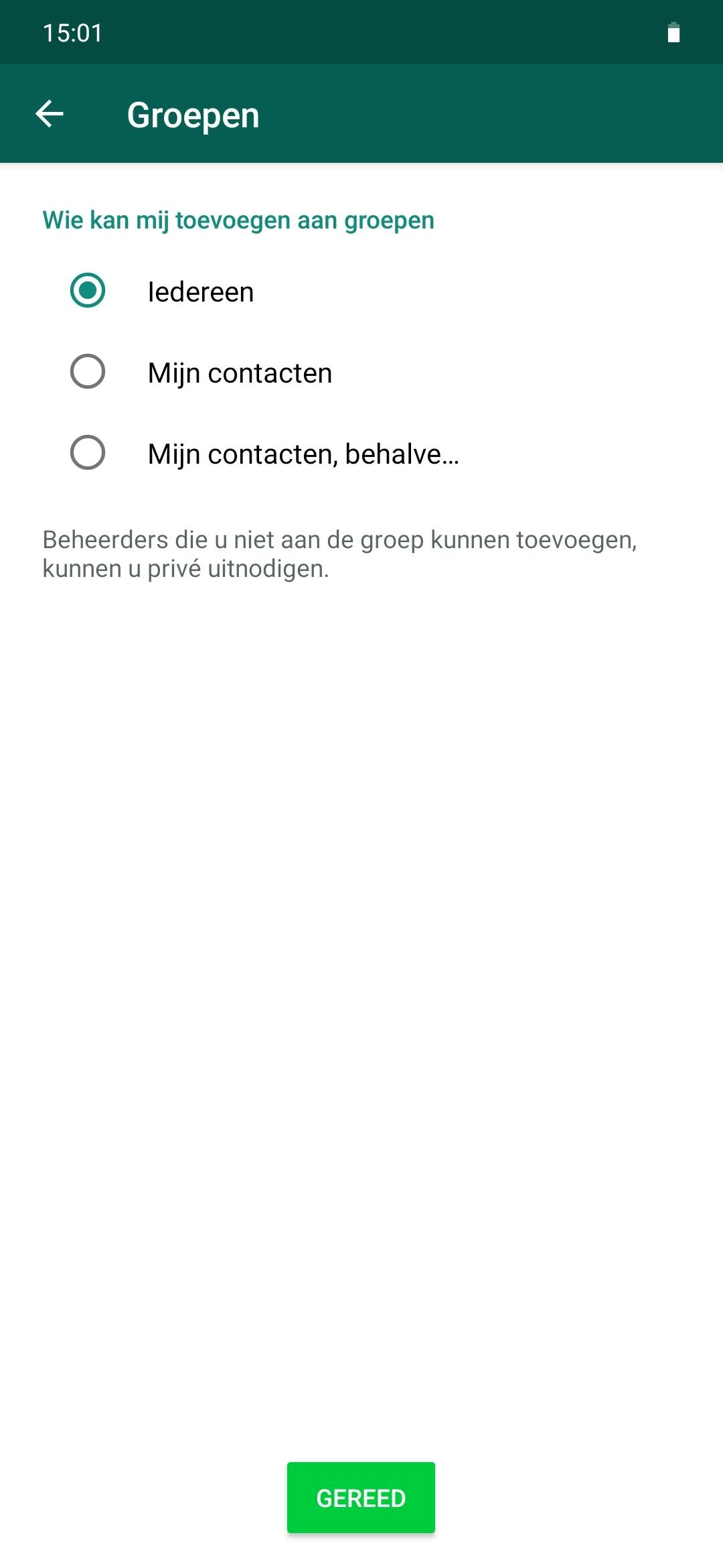 Je kunt dit al beperken door voor de optie te kiezen waaruit blijkt dat je alleen toegevoegd kan worden door je contactpersonen (mits WhatsApp daar natuurlijk toegang tot heeft). In dit geval kunnen mensen die niet in jouw adresboek voorkomen je ook nergens aan toevoegen. Nu is er ook een derde optie, namelijk de optie waarmee je enkele van die contactpersonen kunt blokkeren.