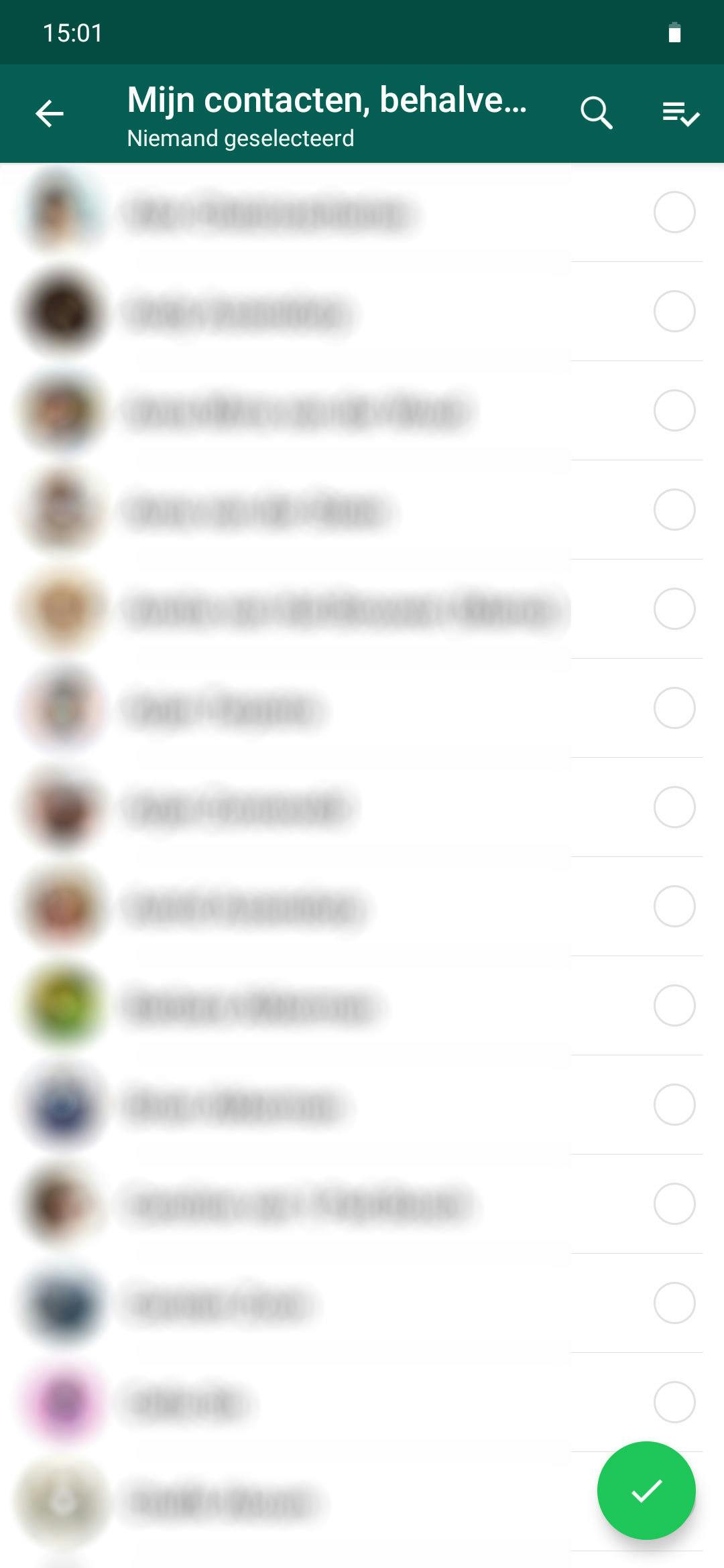 Wanneer je voor die optie kiest, dan kom je in een nieuw scherm terecht. Hier zie je de volledige lijst met contactpersonen staan en kun je per persoon een vinkje achter de naam plaatsen wanneer je niet meer wil dat diegene je kan toevoegen aan groepsgesprekken op WhatsApp.