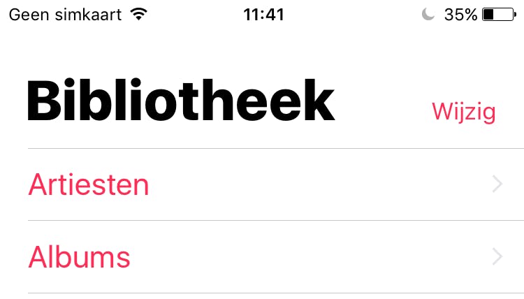 Om albums en nummers op artiest of titel te sorteren moet je in de Muziek-applicatie naar Bibliotheek gaan. Als je je iPad gebruikt moet je nogmaals op Bibliotheek drukken. Open vervolgens Artiesten of Albums. Druk bovenaan op Sorteer en kies de optie Titel of de optie Artiest.