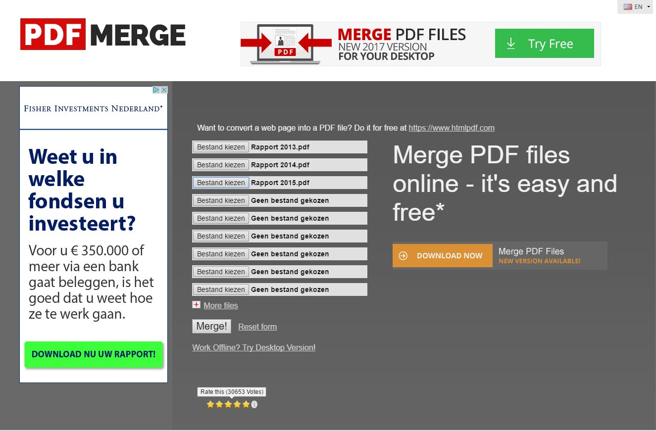 De tegenovergestelde situatie is natuurlijk ook mogelijk: je hebt allerlei losse bestanden gescand en wil die graag combineren in één pdf. Ook dat kan Adobe Acrobat DC, maar ook in dit geval is er een gratis online tool die het voor je kan doen (van dezelfde makers overigens). Surf naar www.pdfmerge.com en upload de bestanden die je wilt combineren tot één pdf. Standaard staan er vier velden, maar door te klikken op More files kun je meer velden toevoegen. Klik vervolgens op Merge! De site gaat voor je aan de slag, en vrijwel direct daarna wordt het gecombineerde pdf-bestand automatisch voor je gedownload. Er is van beide sites overigens ook software beschikbaar die de klus online voor je kan klaren, maar die software is niet gratis.