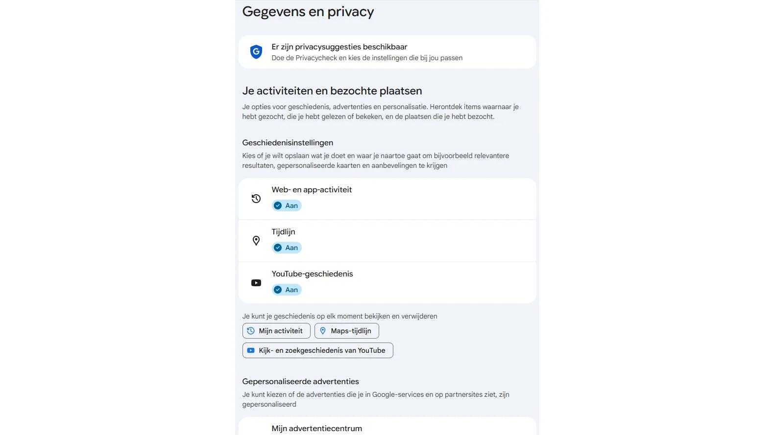 Zet daarnaast gepersonaliseerde advertenties uit op het niveau van je Google-account. Meld je aan bij Google en open Gegevens en privacy. Ga naar Mijn advertentiecentrum en klik bij Gepersonaliseerde advertenties op Aan. Bevestig met Uitzetten en OK.