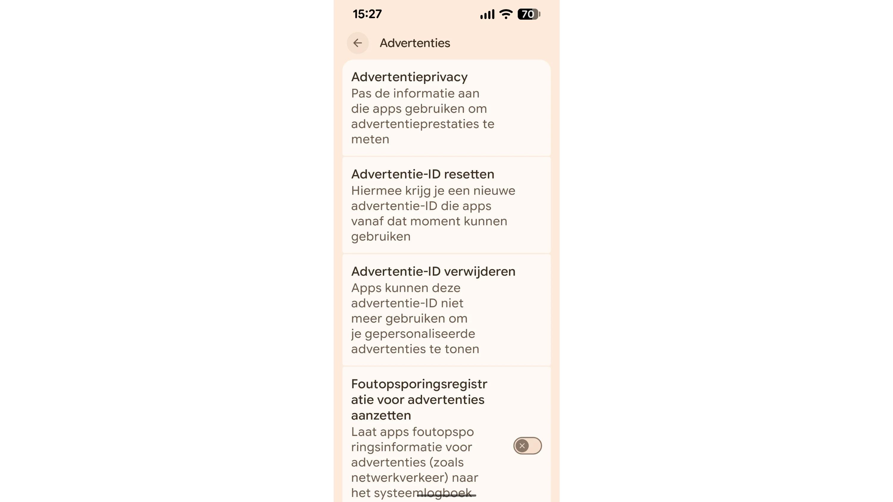 Android gebruikt een advertentie-ID waarmee producenten je gedrag over verschillende apps heen koppelen. Pak dit als volgt aan, afhankelijk van je toestel. Open Instellingen, tik op je naam bij Google-services en -voorkeuren, ga naar Alle services en scrol tot Advertenties. Tik hier op Advertentie-ID resetten en op Bevestigen of kies, nog doortastender, voor Advertentie-ID verwijderen (twee keer). Open hier ook Gebruik en diagnose en schakel deze functie uit.