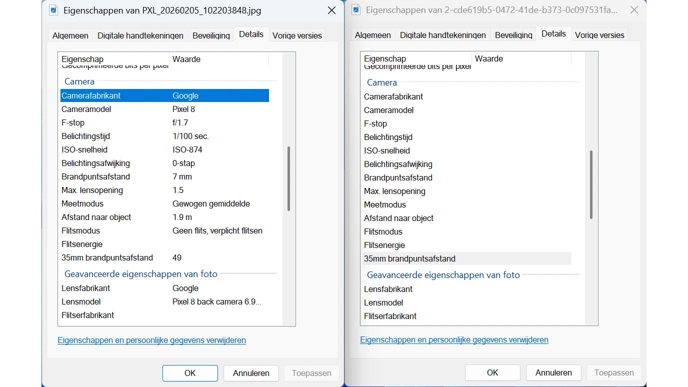 Wanneer je met je smartphone een foto neemt, slaat het systeem allerlei metadata op. Het gaat om gegevens zoals datum en tijd van opname, cameramerk en -model, oriëntatie en iso-waarde. Standaard wordt ook de locatie van de foto meegeschreven. De meeste sociale mediadiensten, zoals WhatsApp, Instagram en Facebook, verwijderen deze locatie automatisch bij het delen, maar je kunt ook je camera-app zo instellen dat de locatie niet wordt opgeslagen. Start de camera-app en open de camera-instellingen. Zoek de optie Locatie opslaan en schakel deze (tijdelijk) uit. Controleer dit door de foto bijvoorbeeld in Google Foto's te openen en deze omhoog te vegen.