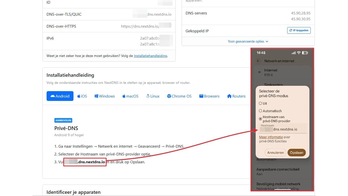 Android ondersteunt al langer privé-DNS, waarmee aanvragen om websites te bezoeken worden versleuteld. Daardoor kunnen je internetprovider, netwerkbeheerder of een aanvaller op het netwerk niet zien welke domeinnamen je opvraagt. Stel dit in via Instellingen. Ga naar Netwerk en internet en open Privé-DNS. Kies je voor Automatisch, dan probeert Android zelf versleuteld DNS over TLS te gebruiken met de DNS-servers van je huidige netwerk, zoals wifi of mobiele data. Kies je Hostnaam van privé-DNS-provider, dan vul je zelf een hostnaam in die altijd wordt gebruikt. Dit kan bijvoorbeeld one.one.one.one, dns.quad9.net, dns.opendns.com of <jouw-hostnaam>.dns.nextdns.io zijn voor meer controle. De meeste van deze diensten versleutelen niet alleen DNS-verkeer, maar blokkeren tegelijk advertenties en trackers en soms ook malware- en phishingdomeinen, zoals bij Quad9.