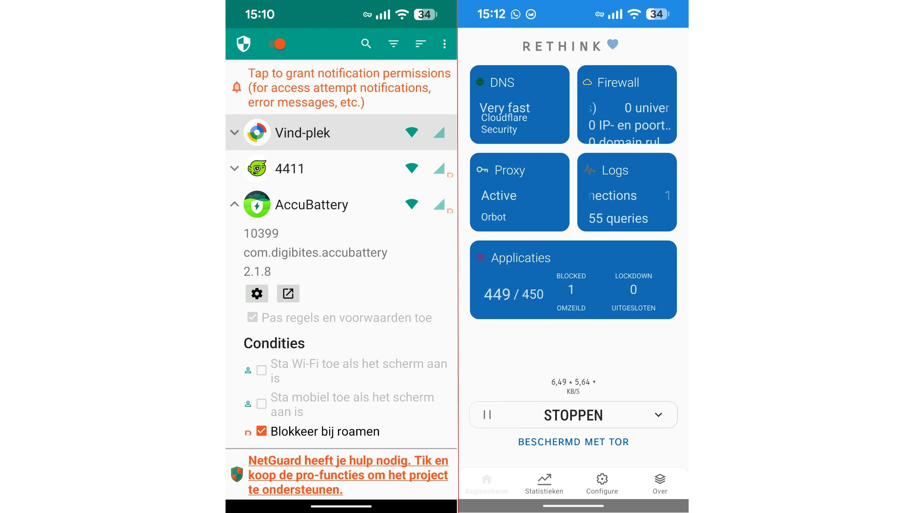 Rethink, eveneens beschikbaar in de Play Store, gaat verder en combineert een lokale firewall met DNS-filtering, netwerklogboeken en optionele tunneling via bijvoorbeeld WireGuard. Het kan ook samenwerken met Tor via de client Orbot. Zo krijg je zonder roottoegang inzicht in achtergrond- en appverkeer en kun je ongewenste connecties blokkeren. Deze aanpak vraagt wel meer configuratie. Beide firewalls laten zich met een tik op de knop aan- en uitzetten.