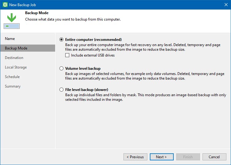 Veeam biedt drie manieren om een back-up te maken. Die vragen om de nodige uitleg. Via Entire computer maak je een volledige back-up van je computer. In de meeste gevallen kies je voor deze mogelijkheid. Veeam zorgt er automatisch voor dat bestanden in de prullenbak, tijdelijke bestanden en wisselbestanden (een soort tijdelijk bestand) niet worden meegenomen in de reservekopie.