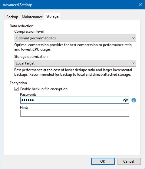 Om de bestandsgrootte verder te verkleinen, open je de tab Storage. Bij Data reduction kun je het compressieniveau selecteren. Ook kun je aangeven waar de back-up wordt opgeslagen: op basis van de locatie past Veeam dan nog verdere optimalisatie toe. Werp ook een blik op het vak Encryption. Hier kun je de back-up met een wachtwoord beveiligen. Vink de optie Enable back-up file encryption aan en geef een wachtwoord op. Neem dit wachtwoord op in je wachtwoordmanager (die uiteraard wel toegankelijk moet zijn in geval van nood). Zonder het wachtwoord heb je geen toegang meer tot de back-up.
