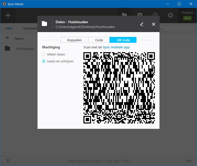 Open de tab QR-code in de desktop-app en kies voor Lezen en schrijven¬. Hiermee wordt een qr-code gegenereerd die deze machtiging mogelijk maakt. Open vervolgens de mobiele app en tik op het plusteken (rechtsonder in beeld). Kies QR-code scannen. De map wordt direct toegevoegd.