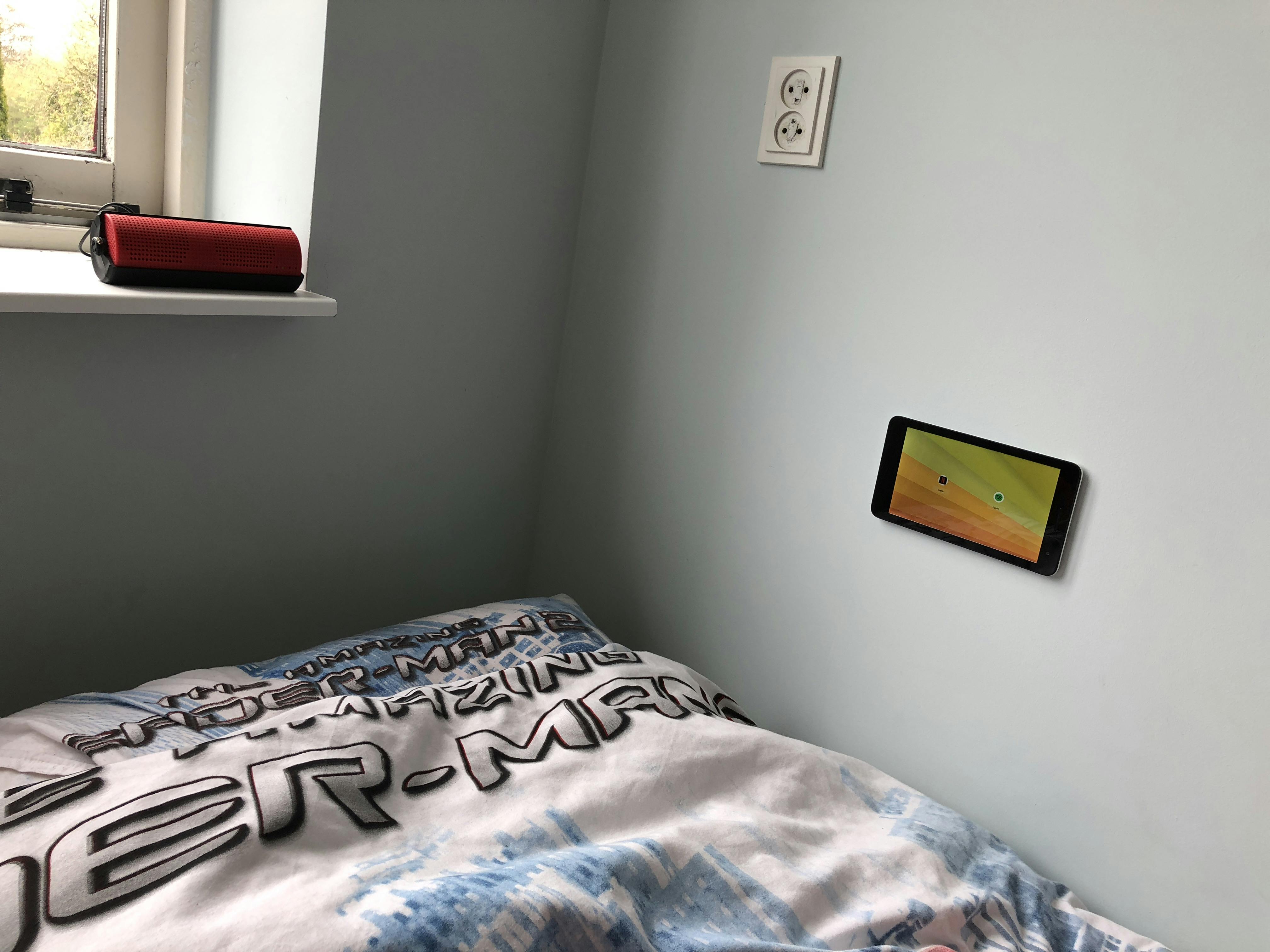 Het eerste dat je nodig hebt is uiteraard een tablet. Dat kun je zo gek maken als je zelf wilt. Als je een iPad aan de muur wilt hangen voor dit doel dan kan dat, maar wij vinden dat zonde van het geld. We zochten een tablet die bewust héél weinig kan. We hoeven er geen spelletjes op te spelen of video’s op te kijken, we willen er niet eens op surfen en e-mailen. Het enige dat onze tablet moet hebben, is een aanraakscherm, Android (of iOS uiteraard), bluetooth en een redelijk lange oplaadkabel (al kun je die ook zelf bestellen als die niet standaard is). We kwamen uit bij de Huawei T1 7.0, waarvoor we bij Mediamarkt precies 59 euro neertelden, inclusief verzendkosten. Een tablet die ons wist te verrassen, want naast Spotify (wat het audiosysteem van onze keuze is in deze basiscursus) werkte Netflix ook als een zonnetje. Er zijn echter genoeg goedkope tablets te vinden, dus houd de aanbiedingen goed in de gaten.