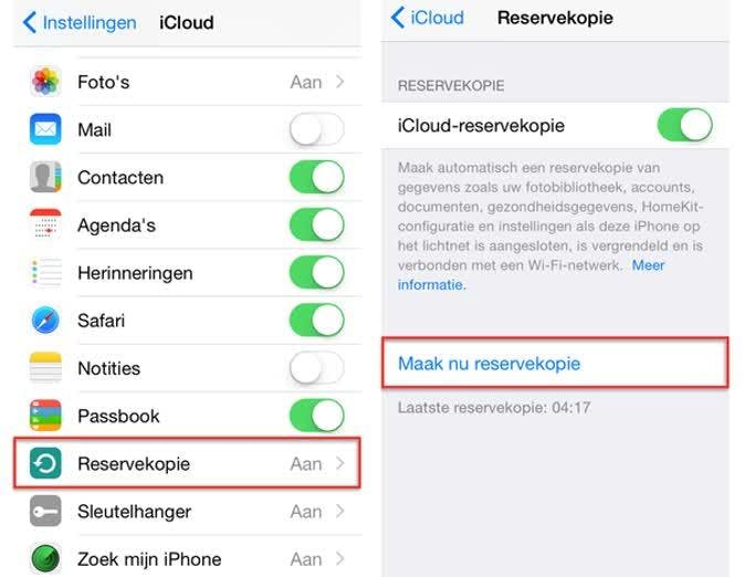 De makkelijkste manier om een back-up te maken is via iCloud. Het enige dat je dan nodig hebt is een goede WiFi-verbinding en genoeg opslagruimte in de cloud. Heb je dat, dan kun je een reservekopie maken door op devices met iOS 8 en hoger naar Instellingen > iCloud > Reservekopie te gaan.