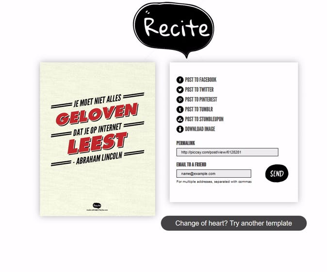 Ook heel populair en viraal zijn citaten. De reden daarvoor is simpel: ze zijn kort en bondig en dus zo gedeeld. Gelukkig is ook dit heel eenvoudig te creëren. Bedenk een citaat of iets dat iemand anders heeft gezegd (citaten van bekende mensen doen het altijd goed) en surf naar www.recite.com. Klik vervolgens onderin op het plaatje dat je mooi bij je tekst vindt passen en klik op Create. Je afbeelding wordt direct gegenereerd en je kunt hem rechtstreeks delen met de diverse sociale netwerken of downloaden via een link.