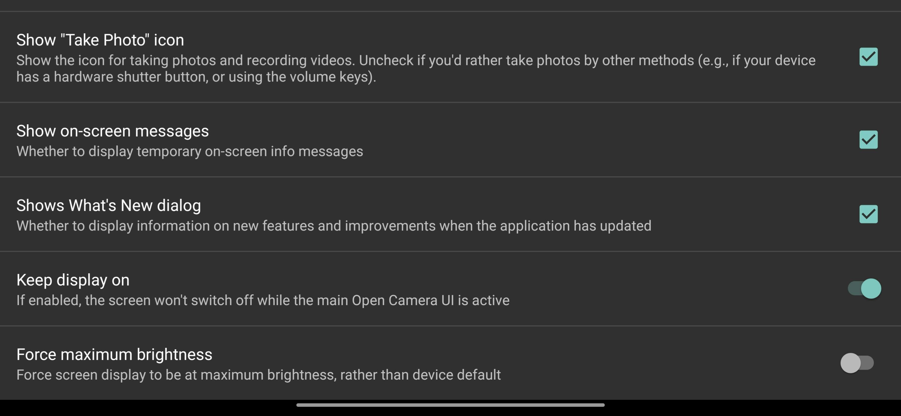 Open Camera zet het scherm op maximale sterkte zodat je goed ziet wat je aan het fotograferen bent. Precies zoals sommige ingebouwde camera-apps dat ook doen. Dit is in de volle zon best prettig is, omdat het scherm dan altijd wat minder goed is af te lezen. Maar wanneer je binnen of op grauwe dagen fotografeert, werkt dit juist verblindend. In dat geval kun je de schermhelderheid uitschakelen. Ga in de instellingen (pictogram van het tandwiel) naar On screen gui, blader helemaal omlaag en schakel Force maximum brightness uit.