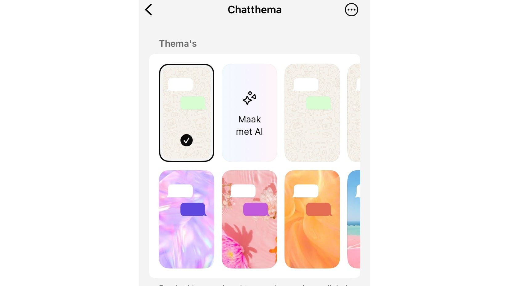 Wil je slechts één gesprek van een ander thema voorzien, dan kan dat ook. Open het betreffende gesprek en tik op de naam van de persoon of groep. Op Android vind je daarna onder de drie puntjes de optie Chatthema; op iOS staat deze knop in het infovenster van de chat. Kies opnieuw voor Maken met AI en typ je beschrijving. Net als bij de algemene instelling kun je doorlopend vernieuwen tot je een thema vindt dat bij het gesprek past. Nadat je op Gereed tikt, wordt het thema alleen op dit gesprek toegepast. Wil je terug naar het standaardontwerp, voer dan dezelfde stappen uit en kies een ander thema of verwijder het aangepaste ontwerp.