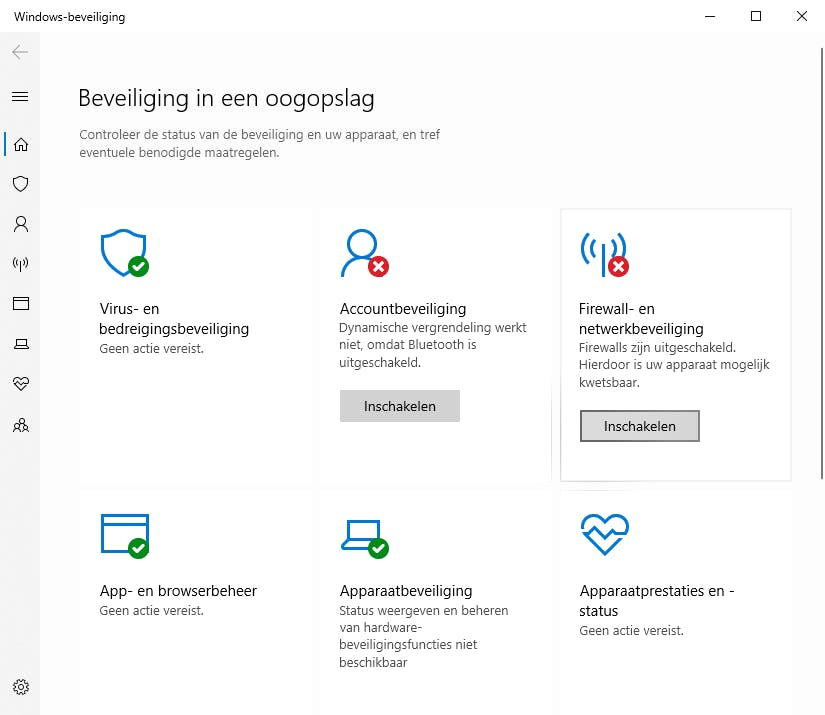 We gaan er in dit artikel van uit dat je gebruikmaakt van de ingebouwde Windows Firewall. Om te controleren of dat zo is, typ je firewall in het zoekvak naast de Windows-knop in en klik je op Status van firewall controleren. Zie je hier rode blokken verschijnen, klik dan op Windows Defender Firewall in- of uitschakelen, kruis bij elk netwerktype Windows Defender Firewall inschakelen aan en bevestig met OK. Je firewall is nu actief en in principe hoef je verder niets meer te doen.