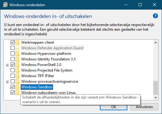 De kans is groot dat je Windows Sandbox zelf ook eerst even moet activeren. Druk op Windows-toets+R, voer optionalfeatures uit, scrol naar Windows Sandbox, plaats een vinkje bij dit item en bevestig met OK. Na een herstart van Windows kun je Windows Sandbox dan gewoon opstarten vanuit het startmenu.
