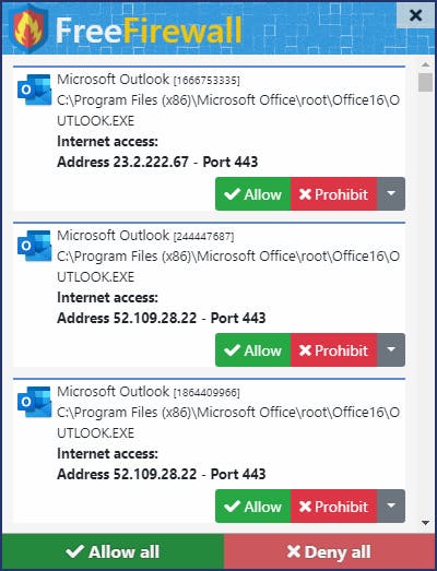 Als je bij een applicatie aangegeven hebt dat er om toestemming gevraagd moet worden, krijg je een pop-upvenster met alle afzonderlijke internetverbindingen te zien die de betreffende applicatie wil opzetten. Nu kun je die weliswaar afzonderlijk toelaten of verbieden, maar we gaan ervan uit dat je alle verbindingen voor de volledige applicatie in één keer wilt toestaan dan wel blokkeren.