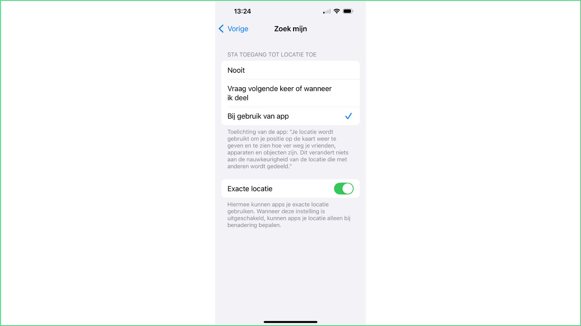Als gps uitstaat, geeft de iPhone geen realtime positie door. Voor optimale nauwkeurigheid ga je naar Instellingen / Privacy en beveiliging / Locatievoorzieningen. Zoek in de applijst naar Zoek mijn en kies Bij gebruik van de app. Wanneer je alleen Locatievoorzieningen hebt ingeschakeld, zal je iPhone alleen de ‘geschatte’ locatie doorgeven. Voor meer nauwkeurigheid moet je daarnaast de optie Exacte locatie activeren. Met alleen een ‘geschatte locatie’ krijg je vaak een brede blauwe cirkel op de kaart te zien, terwijl Exacte locatie het toestel tot op enkele meters nauwkeurig kan lokaliseren. Apple onderscheidt beide opties bewust, omdat sommige apps slechts bij benadering hoeven te weten waar je bent, maar voor Zoek mijn wil je uiteraard maximale precisie.