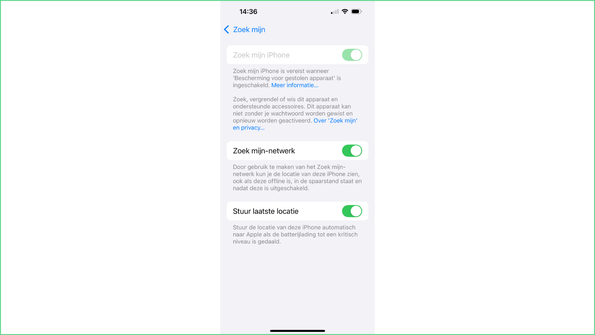 Stuur laatste locatie is een functie op de iPhone die automatisch de laatst bekende locatie van het apparaat naar Apple stuurt, vlak voordat de batterij leeg raakt of voordat het toestel wordt uitgeschakeld. Zo weet je waar het apparaat op dat moment was. Om deze functie te activeren, open je opnieuw de Instellingen en ga je bovenaan naar (Je naam) / Zoek mijn / Zoek mijn iPhone en vervolgens schakel je de optie Stuur laatste locatie in.