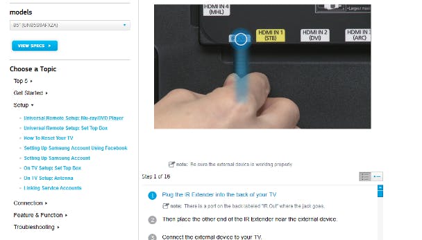 Om een apparaat te verkennen (of om een oplossing te zoeken) met de Samsung Smart Simulator, surf je naar www.samsungsimulator.com. Vervolgens klik je rechtsboven op Select your product. Selecteer eerst de categorie waaronder je product valt, en daarna het model (uiteraard staat nog niet alles online, Samsung voegt naar eigen zeggen dagelijks tientallen producten toe).
