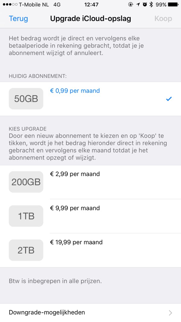 Om de gegevens van je iPhone over te zetten naar een nieuwe iPhone, zul je eerst een reservekopie moeten maken van die gegevens in iCloud. Afhankelijk van de gegevens die je meeneemt in die reservekopie, kan het zijn dat je niet genoeg hebt aan de 5 GB die je gratis krijgt van Apple. In dat geval is het verstandig om wat ruimte bij te huren (je hebt al 50 GB voor 99 eurocent per maand). Je doet dit door op je iPhone te navigeren naar Instellingen / iCloud / Opslag en vervolgens te klikken op Wijzig opslagabonnement. De betaling wordt automatisch verrekend via de betaalmethode die je hebt ingesteld in je account. Lees ook: Zo installeer en gebruik je widgets op je iPad en iPhone.