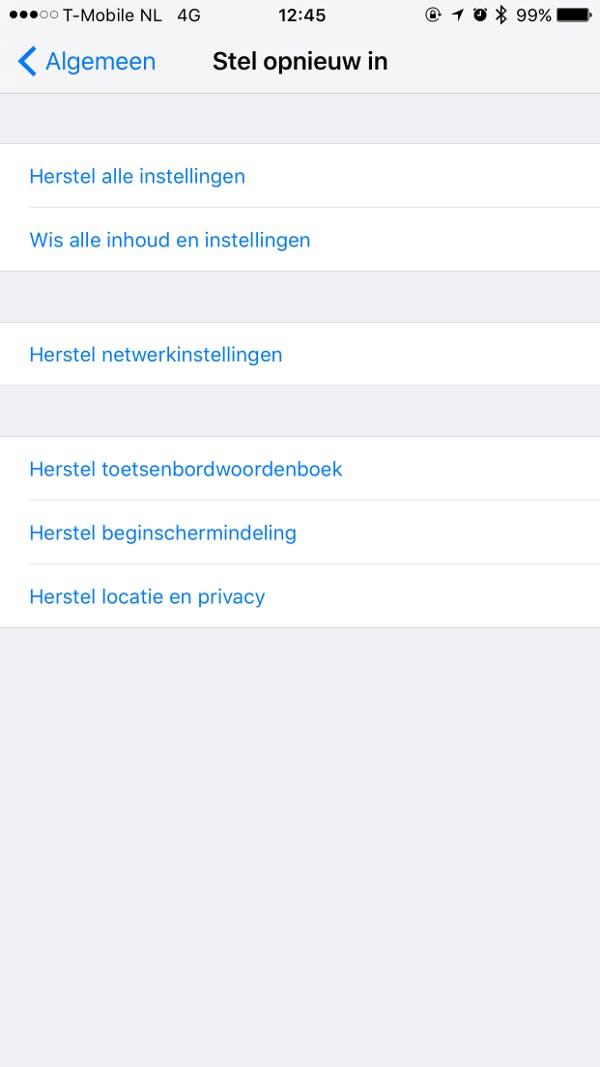 Wanneer je je nieuwe telefoon start, dan kom je terecht in het welkomstmenu van iOS. Je zult een aantal stappen moeten doorlopen met vragen, waarna je de vraag krijgt of je het toestel wilt configureren als nieuwe telefoon of een reservekopie wilt terugzetten. Je kiest in dit geval voor het laatste. Houd er wel rekening mee dat je hiervoor verbonden moet zijn met internet via wifi. Heb je een toestel gekocht of gekregen dat nog niet is teruggezet naar fabrieksinstellingen, druk dan op Instellingen / Algemeen / Stel opnieuw in en vervolgens op Wis alle inhoud en instellingen.