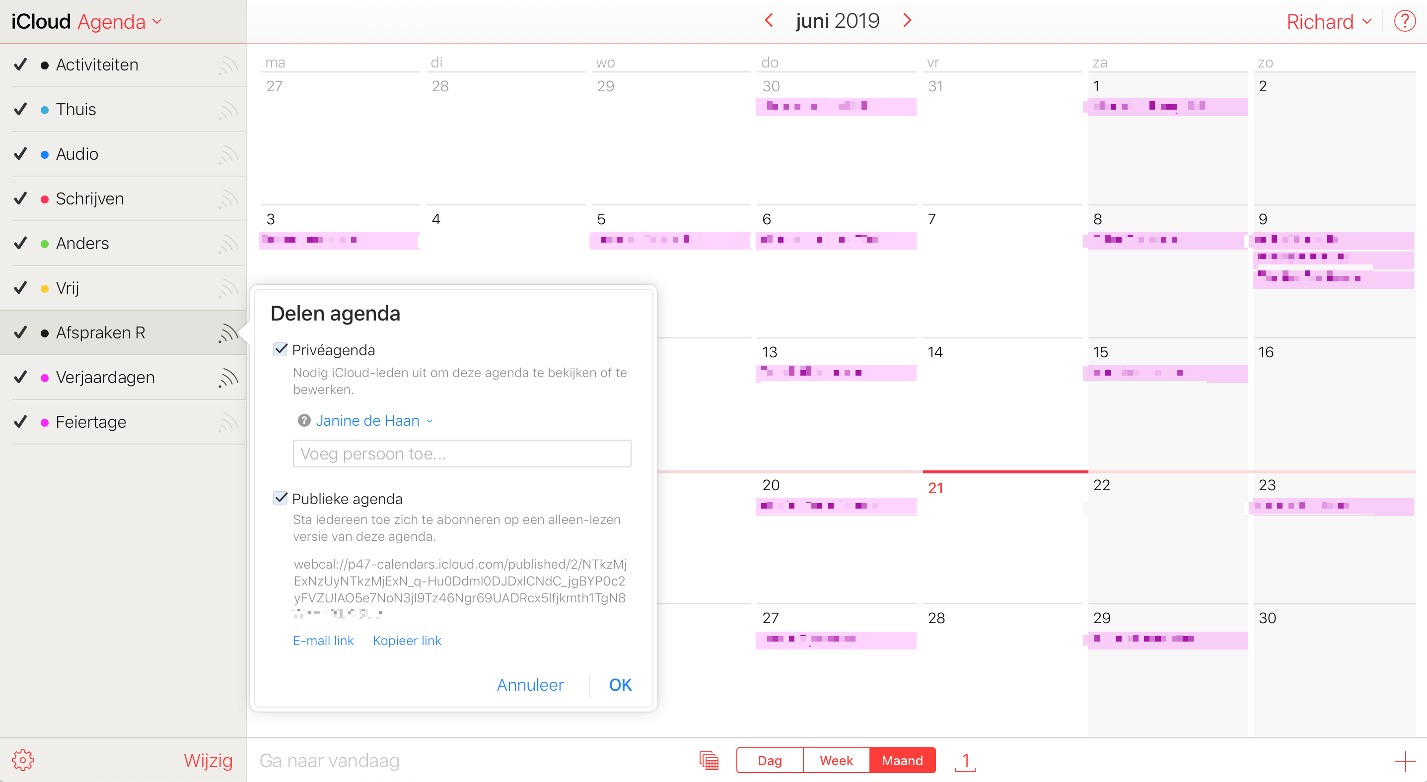Een tweede manier is om je agenda(‘s) te exporteren als ics-bestand en deze te importeren in je Google-agenda. Hiervoor ga je ook naar iCloud en kopieer je het adres dat je onder Publieke agenda hebt gecreëerd naar een browservenster. Vervang http door webcal. Klik op de Enter-toets en als het goed is wordt er een ics-bestand naar je computer gedownload. In je Google-agenda kies je voor Importeren en kies je het bestand. Dit werkt overigens niet altijd even goed, soms worden niet alle afspraken goed geëxporteerd.