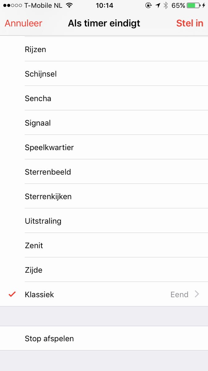 Wanneer je naar onderen scrolt zie je de optie Stop afspelen. Wanneer je deze optie selecteert, zal er geen geluid worden afgespeeld wanneer de timer afloopt, maar zal het geluid juist worden gestopt. En het goede nieuws is: dit werkt niet alleen voor de muziek die fysiek op je iPhone staat, maar ook voor muziek via bijvoorbeeld Spotify, en zelfs video via Netflix!