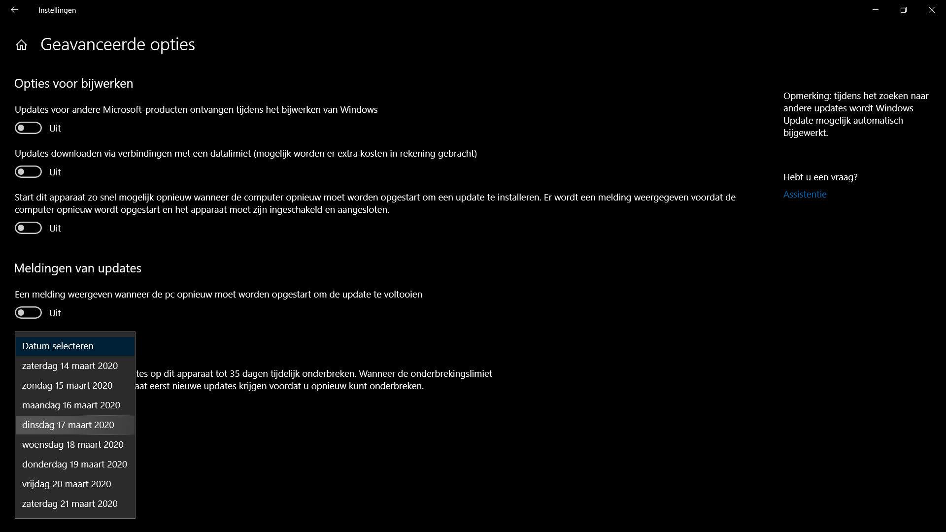 Als je je keuze bevestigt, dan krijg je pc of laptop met Windows 10 tot die datum geen updates meer. Zodra de datum verstreken is, dan moet je je pc wel even updaten voordat de optie wederom beschikbaar is. Wil je de instellingen terugdraaien? Dat kan ook via Windows Update, waar dan een knop staat waarmee je het updaten kunt hervatten.