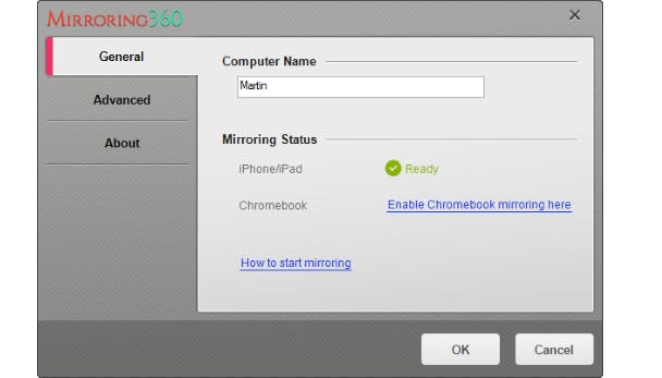 Direct na de installatie van Mirroring360 wordt het programma gestart. Je ziet nu drie tabbladen (de derde is puur informatief). In het bovenste tabblad geef je de computer een naam. Zo weet je iPad meteen op welk systeem de inhoud moet worden weergegeven. In het tabblad Advanced kun je aangeven of het programma automatisch met Windows gestart moet worden en of er een wachtwoord nodig is om AirPlay te gebruiken. Tot slot kun je hier ook aangeven op welke resolutie de inhoud moet worden weergegeven.