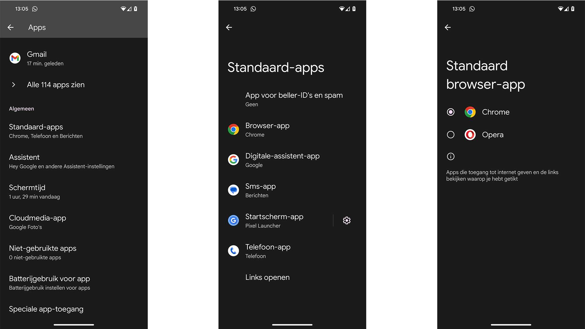 Binnen dit nieuwe scherm zie je eerst een lijst met onlangs gebruikte apps staan, met daaronder de optie Standaard-apps. Tik daarop, zodat je vervolgens op Browser-app kunt tikken. Als je dat doet, dan kom je een lijst tegen met browsers die je geïnstalleerd hebt op je smartphone of tablet. Het enige wat je nu hoeft te doen, is de app selecteren die je wilt gebruiken. Daarna kun je de instellingen afsluiten. Dat kun je doen door een paar keer terug te gaan (door een veegbeweging of met de terugknop) of door simpelweg terug te keren naar het thuisscherm.