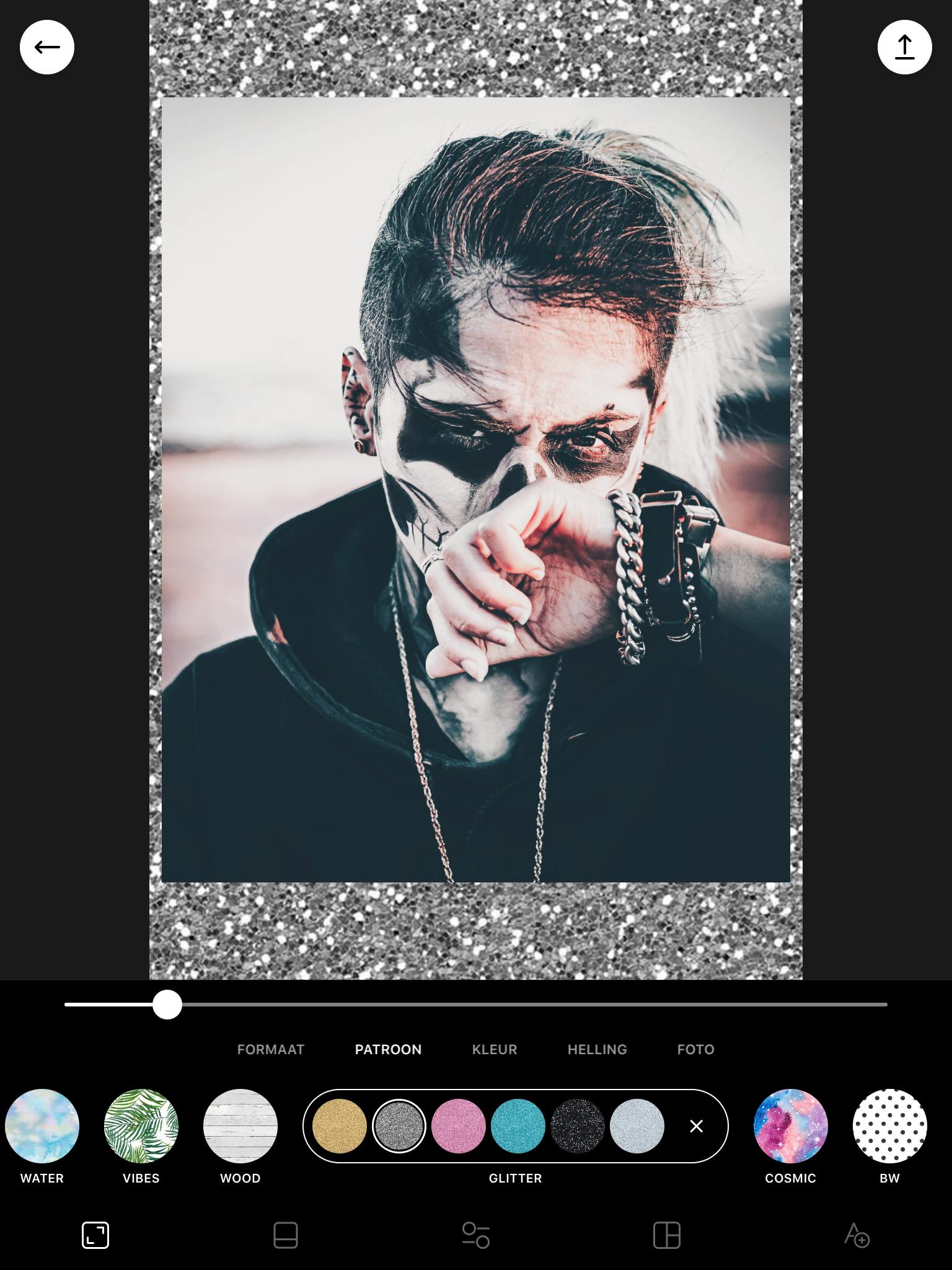 Ook Instasize (Android en iOS) beschikt over veel prachtige frames om aan je foto’s toe te voegen. Dit is een bewerkingstoolkit die je drie dagen op proef mag gebruiken, daarna kost hij 4,99 euro per maand. Je moet dus wel uitkijken en voorkomen dat het abonnement automatisch begint te lopen. Nadat je de afbeelding hebt geselecteerd, gebruik je de balk onderaan om te scrollen. Hier tik je op de eerste knop van links om aan te geven dat je slechts één foto wil bewerken. Daarna kies je bij Formaat bijvoorbeeld de Pinterest-afmetingen. Vervolgens selecteer je een kleur of een patroon voor het kader.