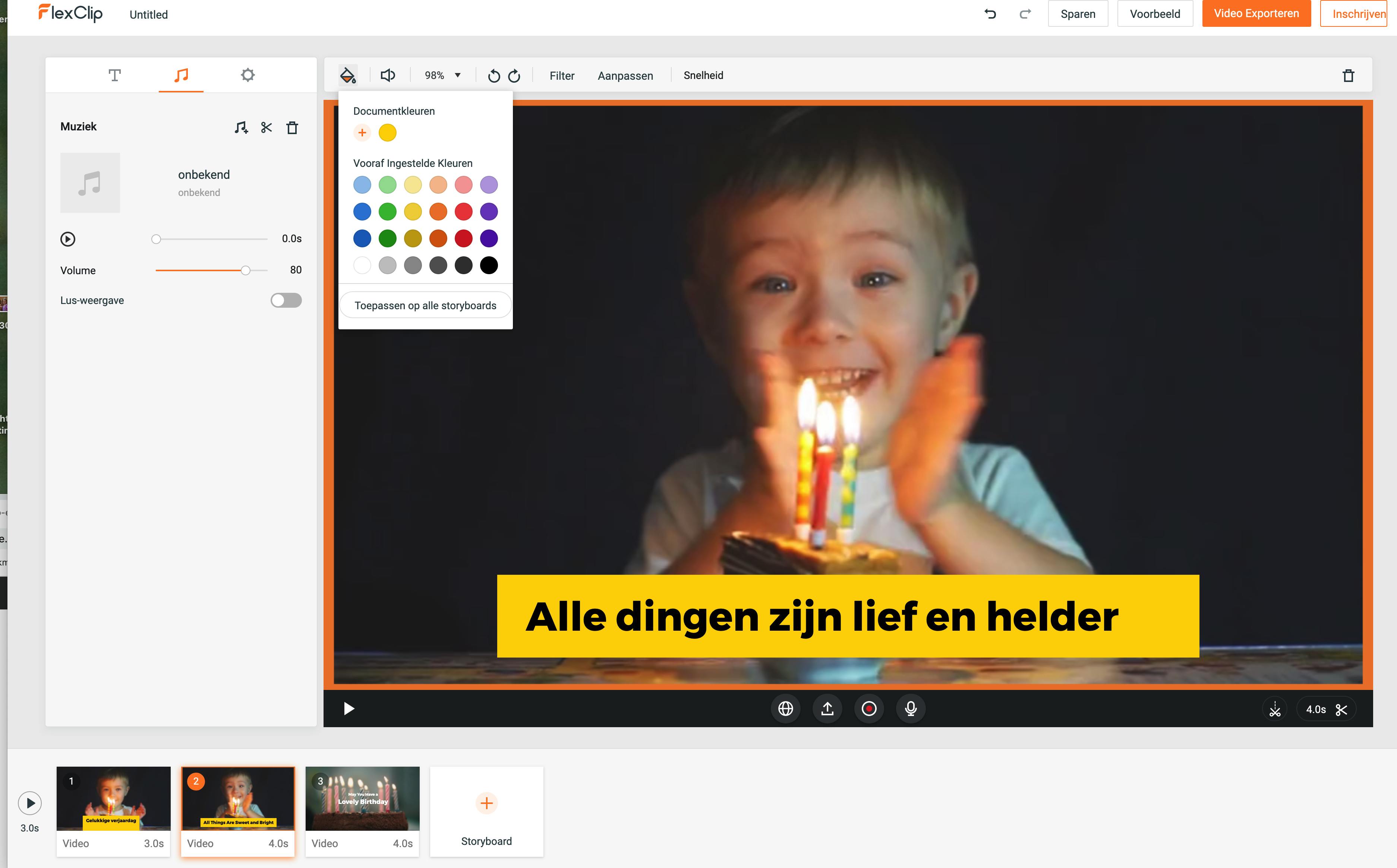 Om video van een sobere rand te voorzien kun je de gratis online video-editor van FlexClip gebruiken. Eerst voeg je de clip(s) aan het storyboard door op het plusteken te klikken. Vervolgens ga je naar de instellingen, de knop met het tandwieltje, waar je de gewenste videoverhouding selecteert. Je hebt de keuze tussen 16:9, 1:1 of 9:16. De rand voeg je toe door het beeldmateriaal een beetje te verkleinen. Bovenaan wijzig je de zoomverhouding die standaard is ingesteld op 100 procent naar bijvoorbeeld 95 procent. Hierdoor verschijnt er een zwarte rand om de foto, die dus 5 procent van het totaalbeeld uitmaakt. Klik daarna op het emmertje, oftewel de knop Kleur toevoegen, en kies je een kleur die je leuk vindt. Het resultaat is dus een video met een gekleurde rand. Klik op de voorbeeldknop om de video te bekijken en als je tevreden bent, kun je het ingekaderde filmpje downloaden in 480p, 720p of 1080p.