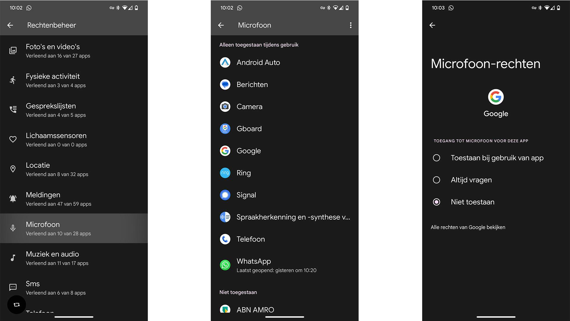 Je moet even scrollen, maar op een gegeven moment kom je de optie Microfoon tegen. Onder dat kopje kun je zien hoeveel apps toegang hebben tot de microfoon. De kans is groot dat je hier apps als WhatsApp, Signal, Ring, Android Auto en Gboard aantreft; apps waarbij het logisch is (of kan zijn) dat ze die toestemming hebben. Mocht je een app zien staan die je niet vertrouwt, tik daar dan op en tik in het volgende scherm op Niet toestaan. Daarmee voorkom je dat de app de microfoon gebruikt of stiekem meeluistert.