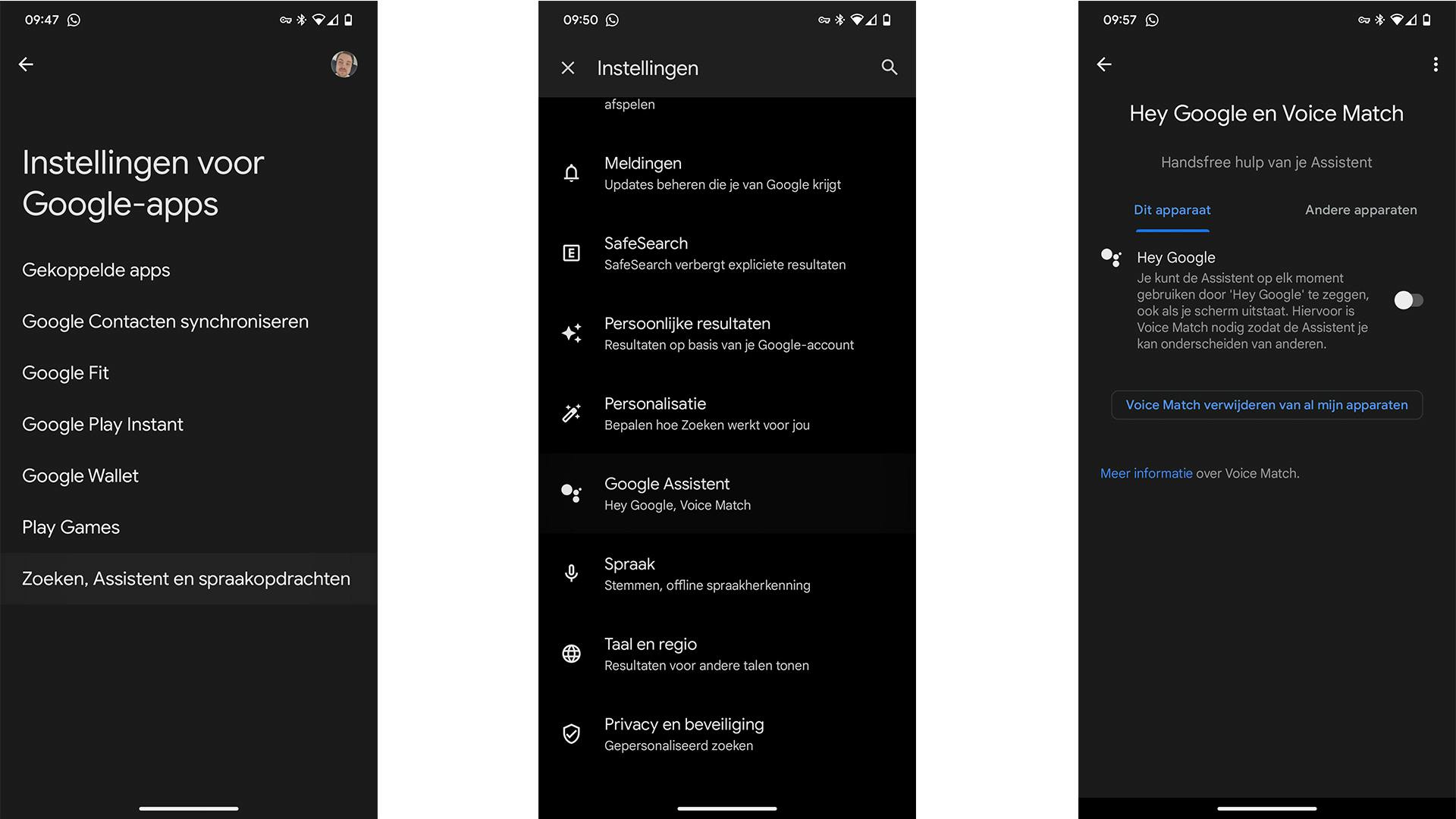 Als je helemaal klaar bent met de Google Assistent en niet van plan bent die te gebruiken, dan kun je op deze pagina ook meteen Voice Match verwijderen. Onder de schuifregelaar zie je namelijk een blauwe regel tekst staan waarmee je dat regelt. Onthoud dat wanneer je dat doet, Voice Match ook van andere apparaten verdwijnt.