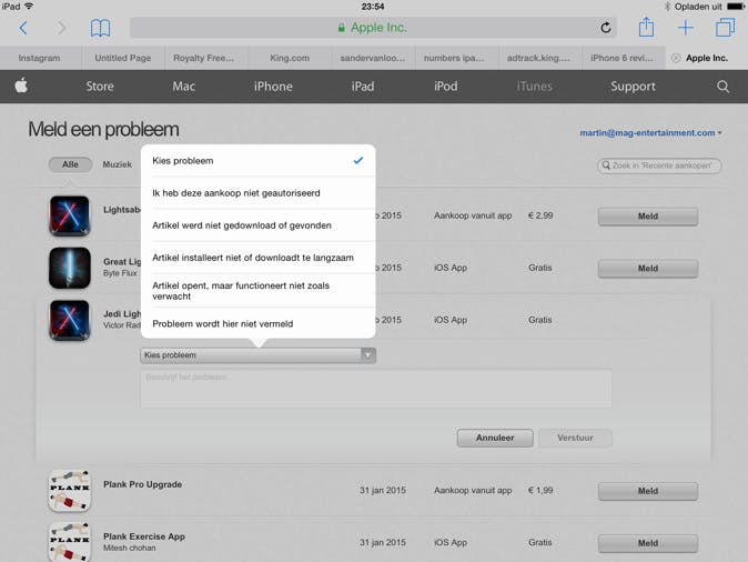 Een optie die je tot slot nog rest is het volledig opnieuw installeren van je iPad, maar we kunnen ons bijna geen app indenken die zoveel gedoe waard is. Als een app écht niet werkt, kun je altijd besluiten om je geld terug te vragen bij Apple. Veel mensen realiseren zich namelijk niet dat dit kan. Wanneer je ontevreden bent over een app, omdat deze niet doet wat hij belooft, of, zoals in dit geval, niet werkt, dan kun je daarvoor je geld terugvragen. Het is logisch dat Apple dit niet van de daken schreeuwt, maar het kan wel. Om een app 'terug te brengen' naar de App Store, surf je naar http://reportaproblem.apple.com binnen 14 dagen na de aankoop en log je in met je Apple ID. Vervolgens klik je op Meld achter de app waarvoor je je geld wilt terugvragen. Klik op Kies probleem en kies voor Artikel opent, maar functioneert niet zoals verwacht. Vervolgens beschrijf je het probleem in het veld daaronder en klik je op Verstuur. Binnen enkele dagen wordt je aankoop geannuleerd (mits je echt een terechte klacht hebt).