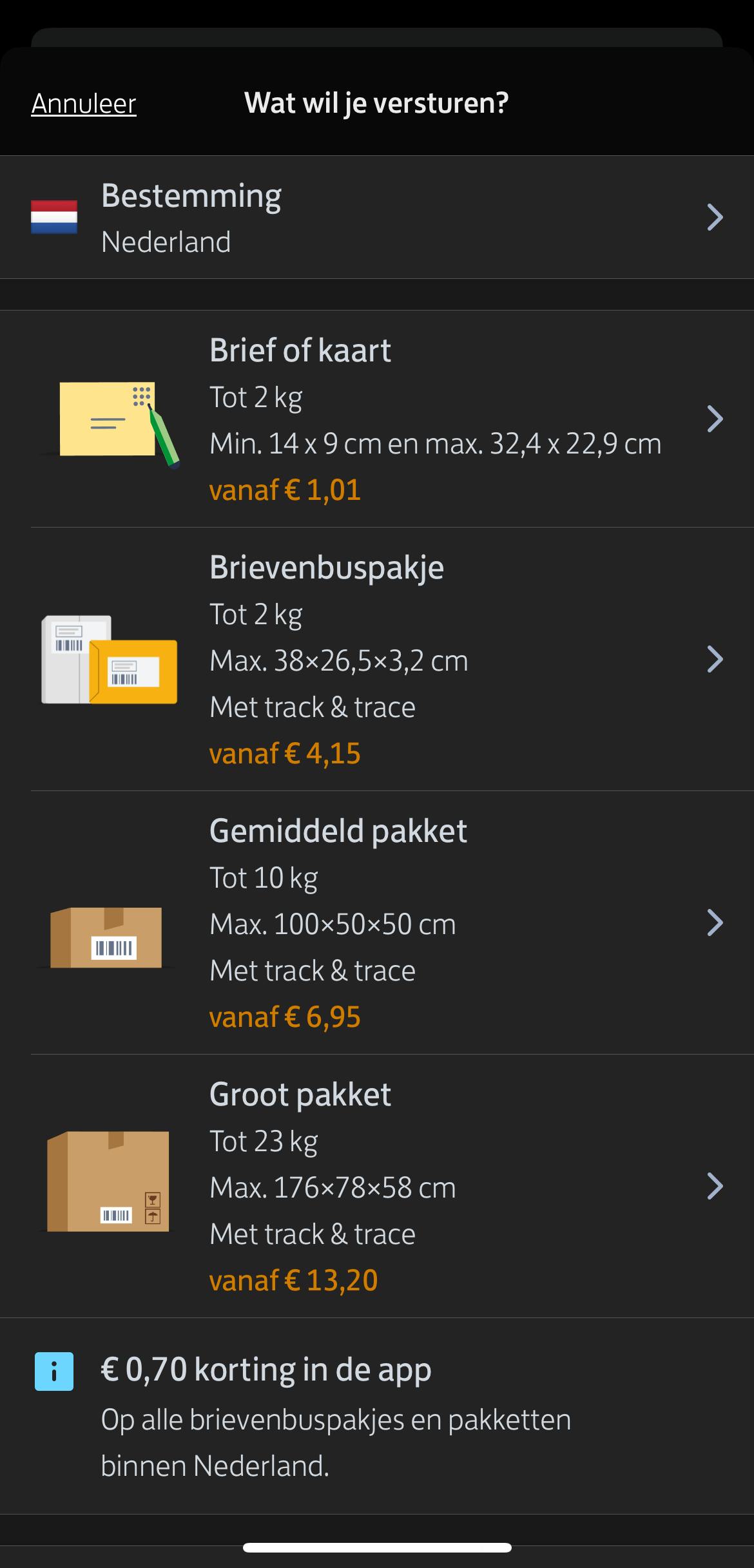 In de PostNL-app kun je op elk gewenst moment postzegels, zegelvellen of speciale kaarten met zegels aanschaffen. Ook enveloppen in allerlei formaten zijn direct beschikbaar. De aankopen verschijnen meteen als barcode in de app of worden thuisbezorgd. Zo hoef je nooit meer langs een postkantoor voor zegels en kun je vanaf elke locatie je post schrijven en versturen. Superhandig!