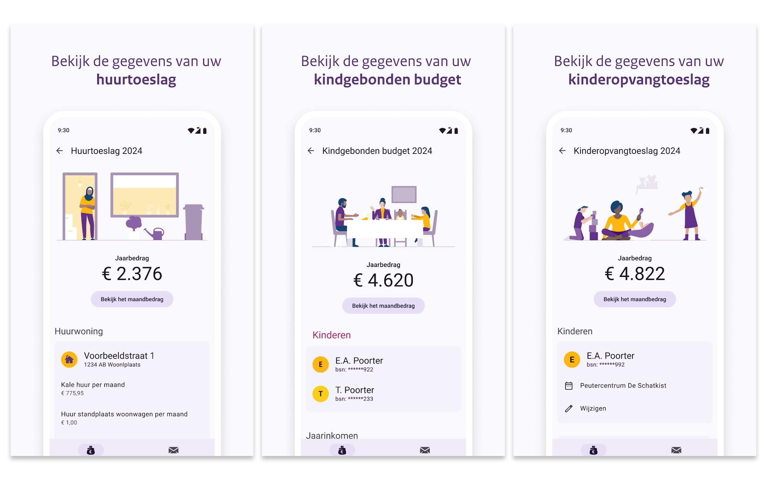 In de Toeslagen-app zie je alle toeslagen die je krijgt overzichtelijk onder elkaar. Bij elke toeslag kun je de actuele toeslag zien en wijzigingen doorgeven. Het hangt van de toeslag af welke functies de app precies aanbiedt. Zo kun je bij de kinderopvangtoeslag wijzigingen in de kinderopvanglocatie of -dagen doorgeven. En bij de huurtoeslag kun je na je verhuizing naar een ander huurhuis je nieuwe huur doorgeven. Een wijziging van je inkomen is voor alle toeslagen van belang.