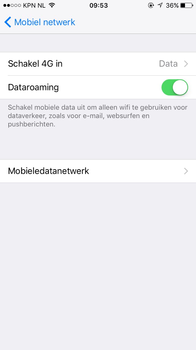 Ook op je iPhone is het inschakelen weer heel eenvoudig. Ga via Instellingen naar Mobiel netwerk. In dit menu kun je je mobiele data en persoonlijke hotspot in- of uitschakelen. Onder het kopje Mobiele data vind je Opties mobiele data, daar kun je Dataroaming inschakelen. Ook kun je bepalen of je roaming alleen wil gebruiken voor data, of voor gesprekken en data.